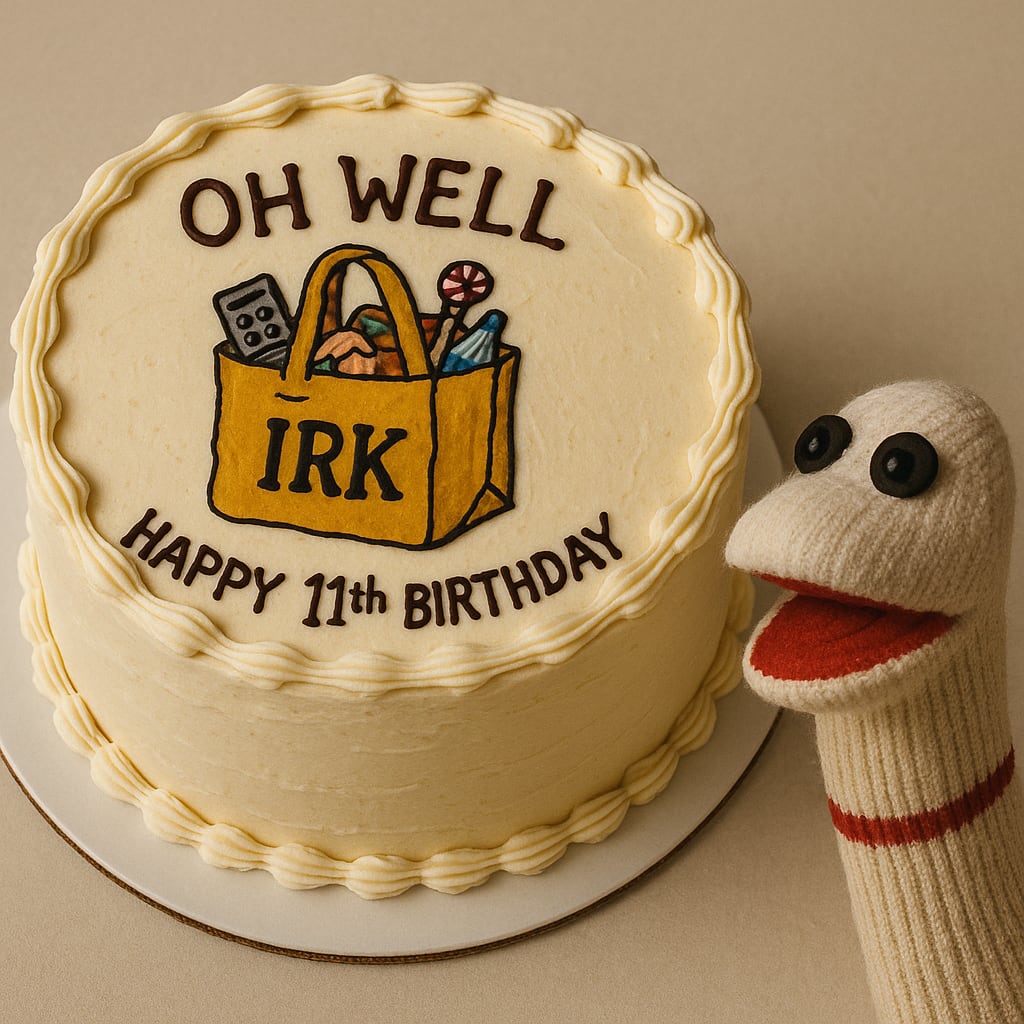 /showme a birthday cake that evokes ennui, irony, sarcasm, and low expectations, including imagery of a reusable yellow tote bag full of nonsense with “IRK” on the side, that reeks of wit and candor and low expectations, that includes hints of online retail and an unsettling undercurrent of regret. the cake should be vanilla and the image should incorporate Glenn the sock puppet, perhaps preparing to indulge. it’s for an eleven year old, but maybe one with an old soul.