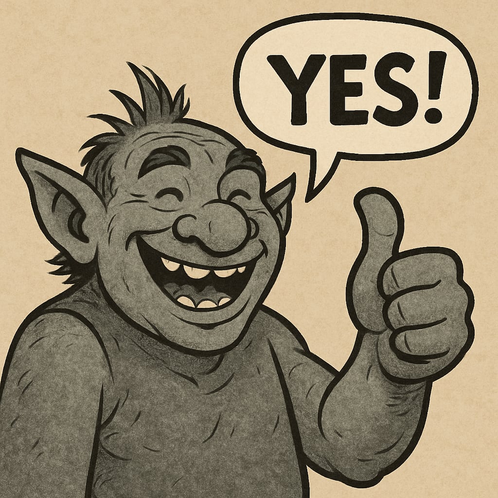 @jouest @tinamarie1974 /showme a smiling gray troll saying yes