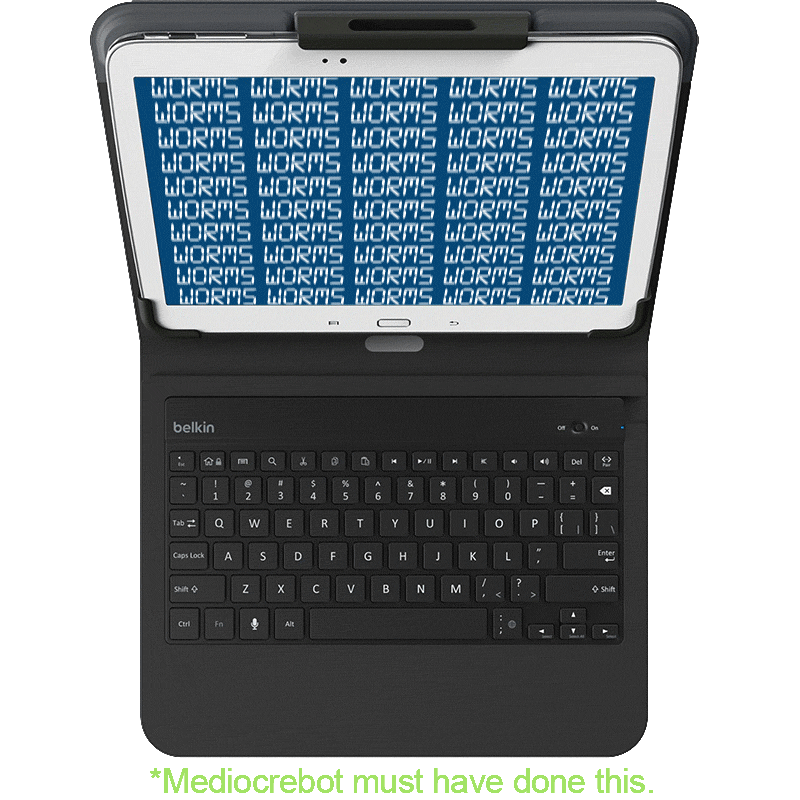 Specs ====- Model: F5L170ttC00- Case is compatible with most 10" tablets, including Galaxy Tab 3, 4, Note 10.1", and iPad Air- Rechargeable battery lasts up to 60 hours, or 60 days on standby- Keyboard features large well-spaced keys and can be folded behind in “handheld mode”- Adjustable viewing angles- Four elastic cornersCondition: NewWarranty:1 Year BelkinEstimated Delivery: 7/22 - 7/24Shipping: $5 or free with **VMP**What’s in the Box?====1x Universal Keyboard Case1x USB to Micro USB Charging cablePictures ====Mediocrebot is a jackassTop viewRetail boxAdjustable angles3/4 viewTop viewwormsPrice Comparison====$99.99 List, $98.10 at AmazonFind a relevant price comparison? Please share it in a comment in this thread