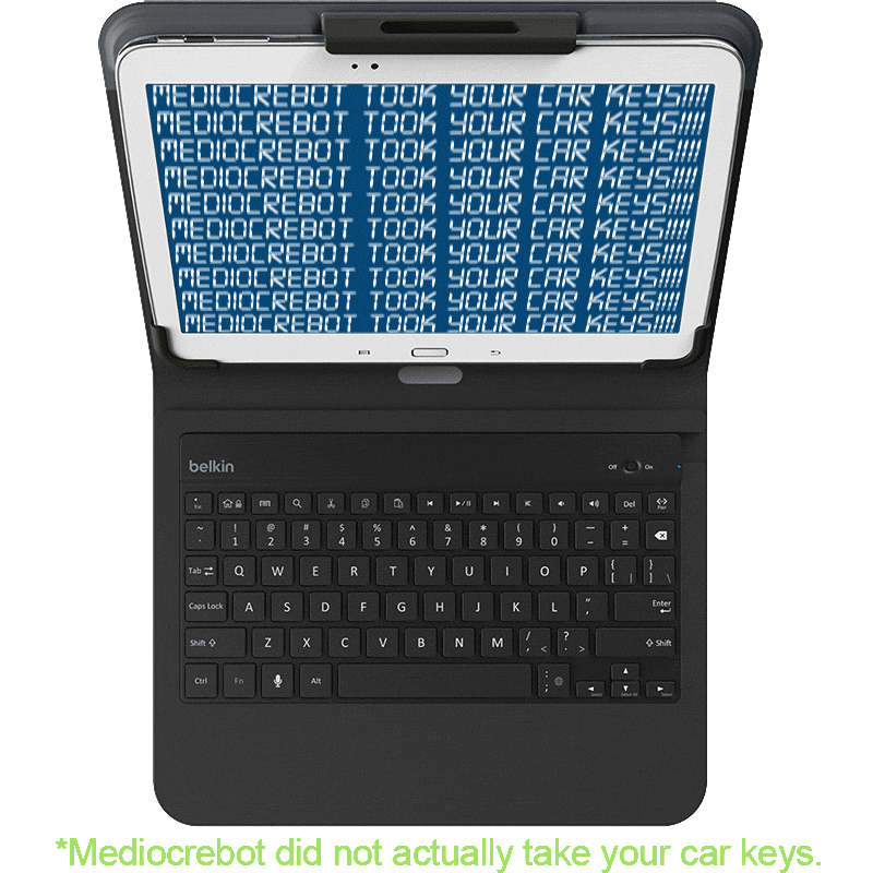 Specs ====- Model: F5L170ttC00- Case is compatible with most 10" tablets, including Galaxy Tab 3, 4, Note 10.1", and iPad Air- Rechargeable battery lasts up to 60 hours, or 60 days on standby- Keyboard features large well-spaced keys and can be folded behind in “handheld mode”- Adjustable viewing angles- Four elastic cornersCondition: NewWarranty: 1 Year BelkinEstimated Delivery: 7/22 - 7/24Shipping: $5 or free with **VMP**What’s in the Box?====1x Universal Keyboard Case1x USB to Micro USB Charging cablePictures ====Mediocrebot is a jackassTop viewRetail boxAdjustable angles3/4 viewTop viewwormsPrice Comparison====$99.99 List, $98.10 at AmazonFind a relevant price comparison? Please share it in a comment in this thread
