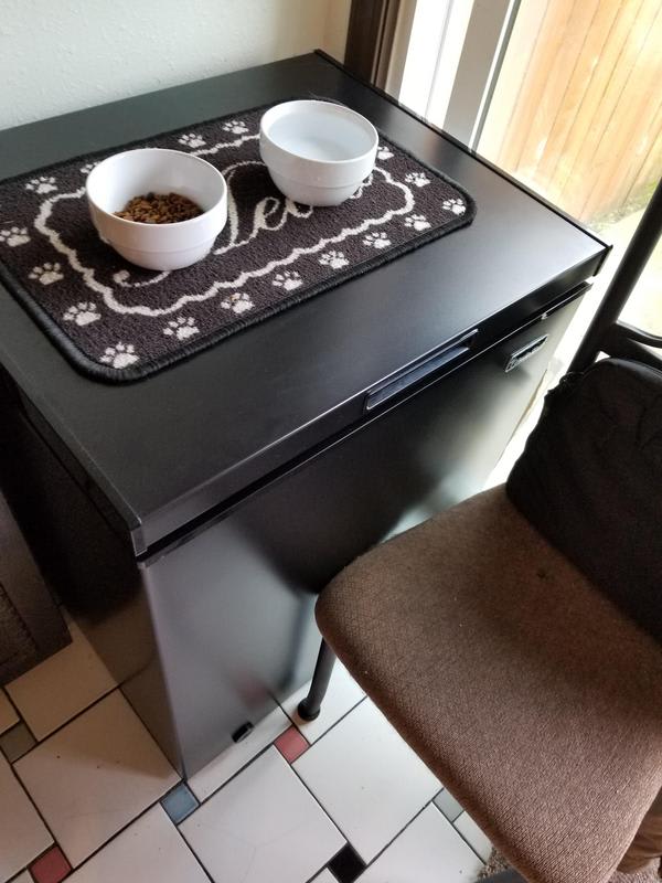 I bought Mr. Whiskers a snazzy new chest freezer to set his food bowls on. Pretty classy huh?