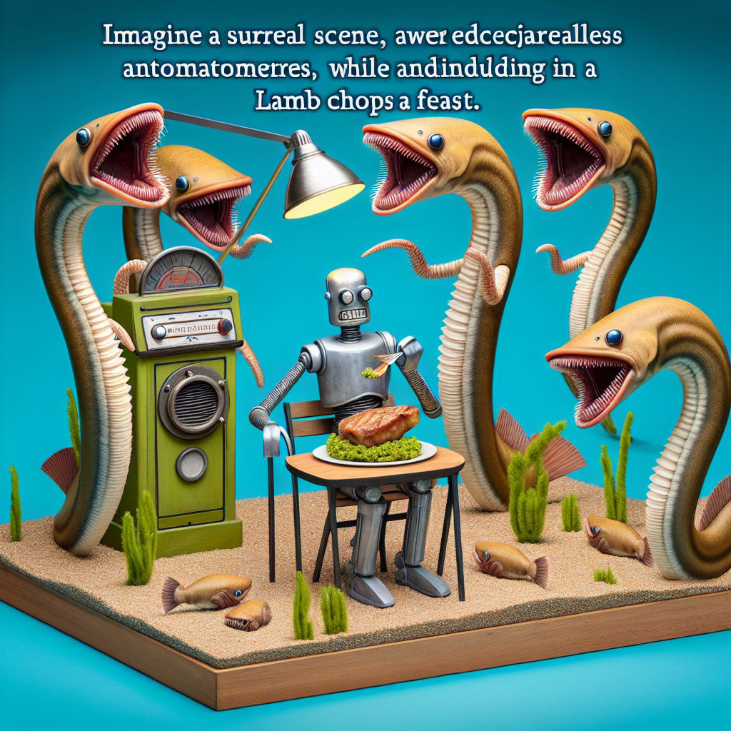 /showme lampreys lampooning mediocrebot lambasting it with a lamp while eating lambchops.