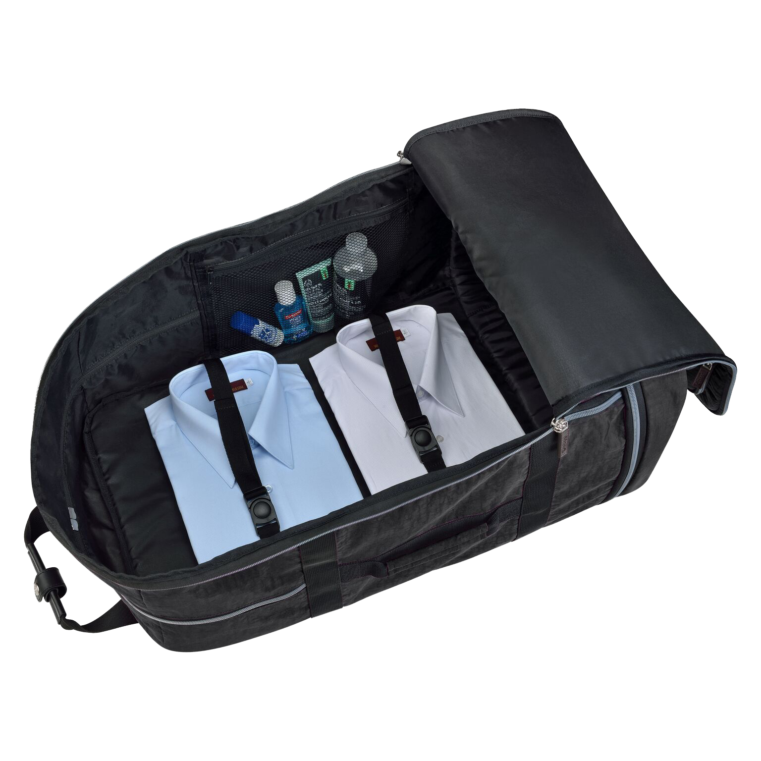 Shit, I love things that fold into themselves! This looks like it would pretty much need to be treated like a top-loading duffel bag, though. Strapping your shirts and bottles in all pretty like that would probably just let it flop over.