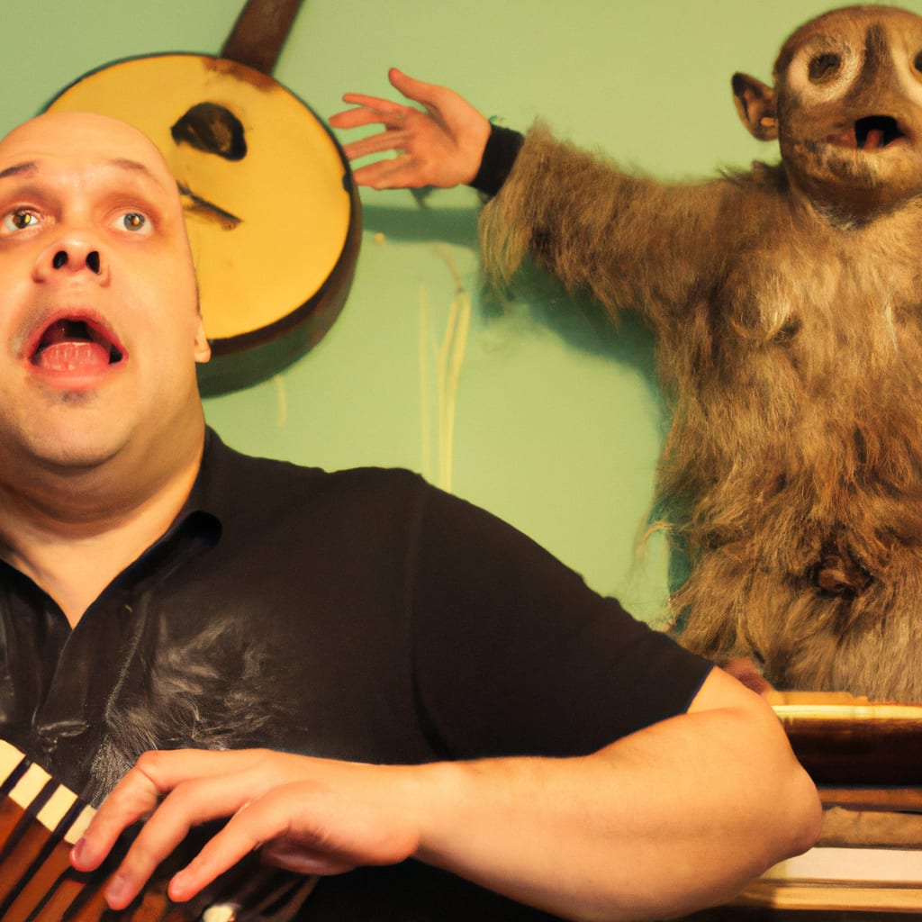 /showme bald guy making silly songs in the afterlife, behind him is possum taxidermy