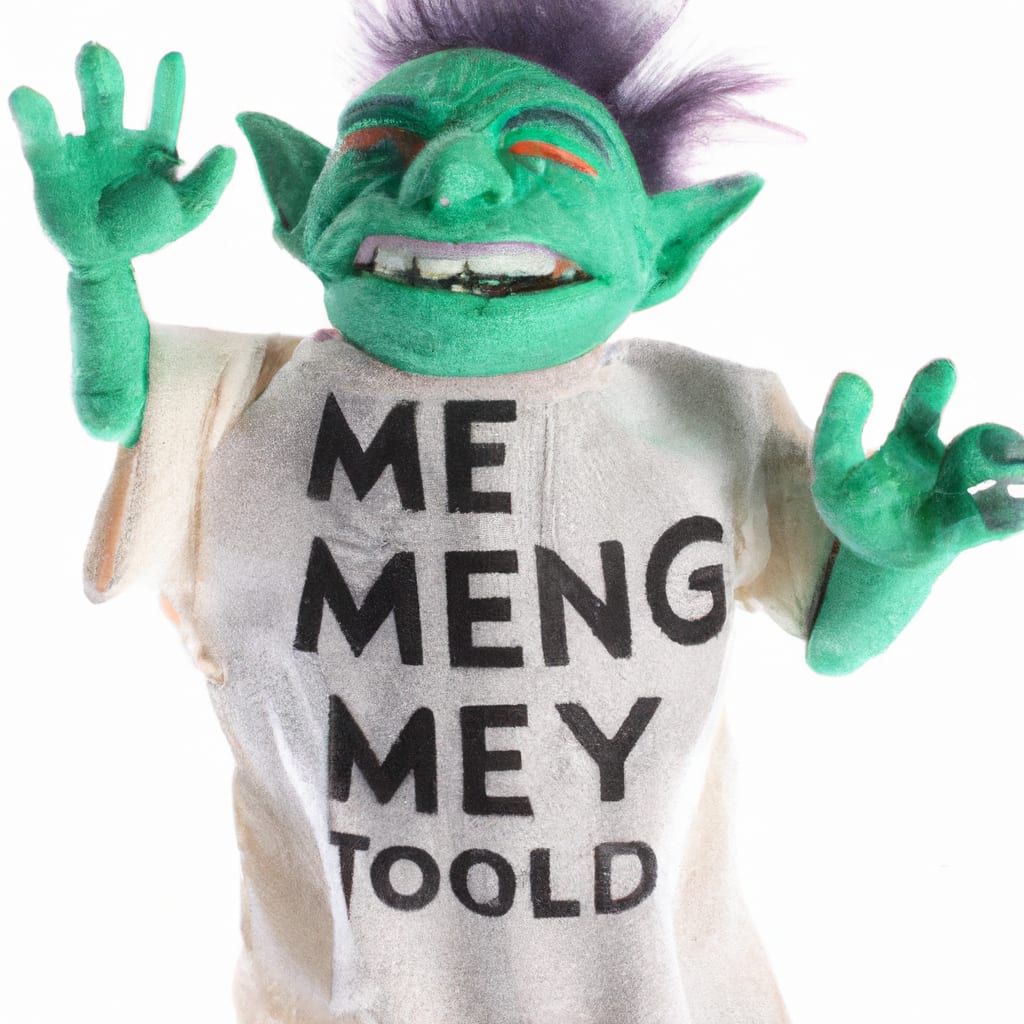 /showme a cute friendly troll puppet wearing a shirt that says “meh” being resurrected from the dead
