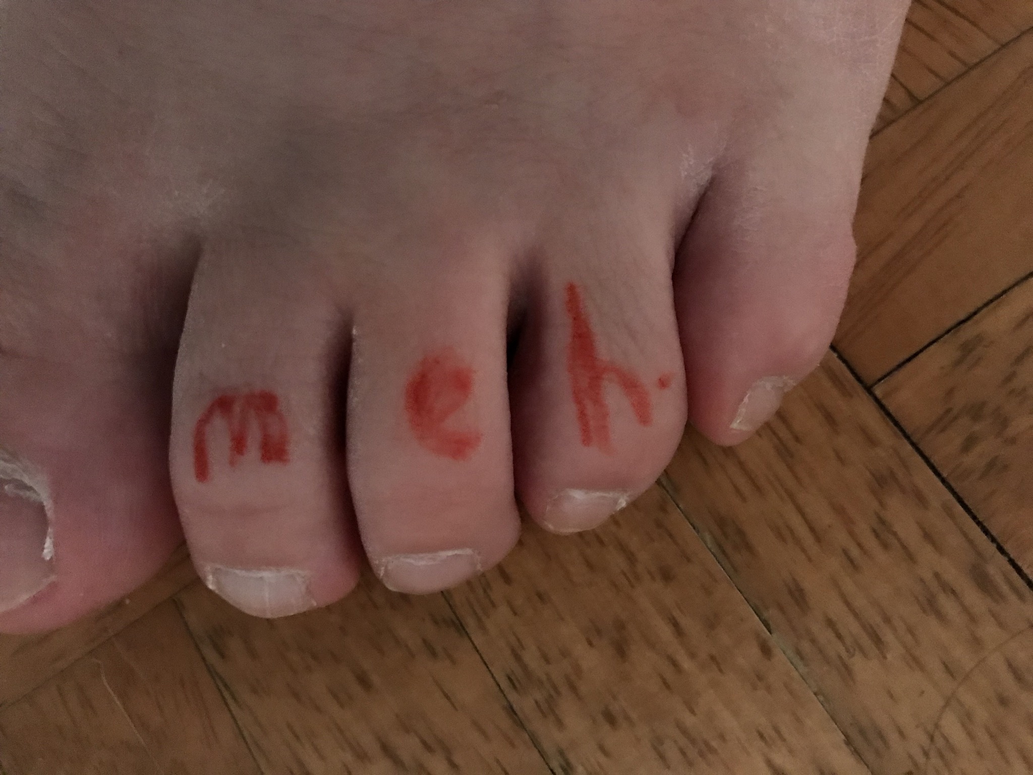 So, I may be late to the game here, but since I’ve mentioned that I think I would like a real meh on my toes (in the real tattoo thread) I figured I’d try a temp version out. Im sure an artist could do better than me trying to write meh upside down, but I do like it! Now I must seriously consider a real one