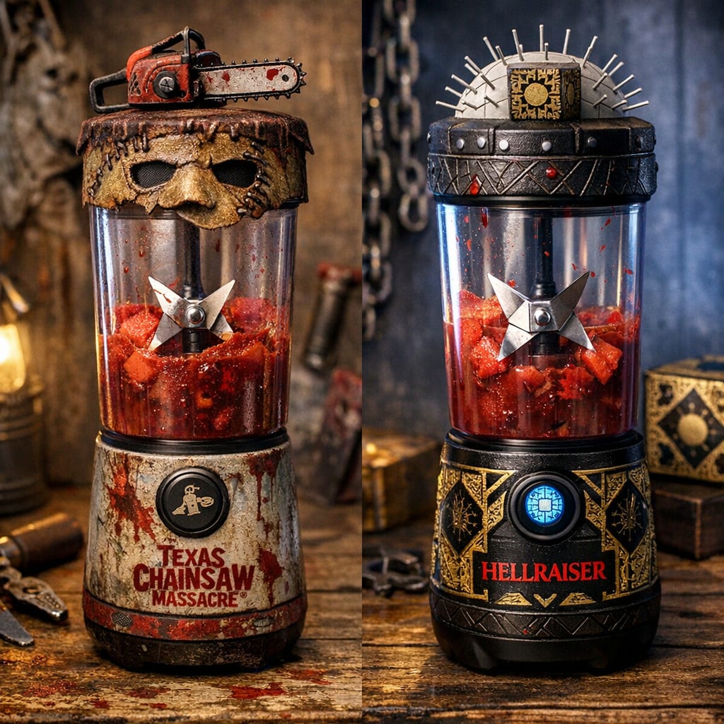 @zippyus Here’s the image you requested for “safe for work texas chainsaw massacre and hellraiser themed handheld portable steel blade blenders”