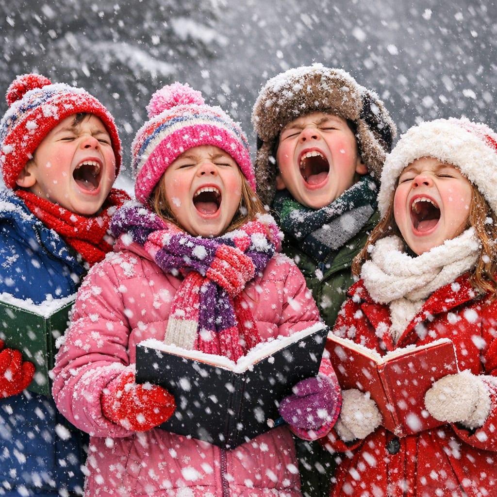 /showme Children dress warmly are outside in the snow singing REALLY LOUD.