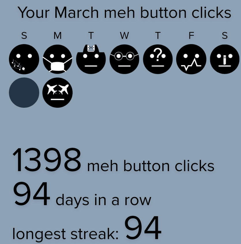 @stolicat I suspect not. Didn’t notice until after my original post that it thinks I have 8 clicks in a row. But either i “sleep clicked” on Sunday without remembering and Sunday had a blank face, or meh’s counting is meh.