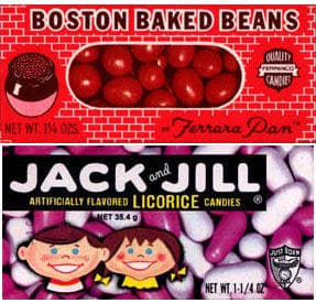 The Candy Wrapper Museum’s extensive online collection of, yeah, candy wrappers has long made it one of my favorite retro design sites. Two companies tower over all others in terms of a whimsical yet unified visual aesthetic: Ferrara Pan (makers of Lemonheads, Boston Baked Beans, et al.) and Just Born (best known for Mike and Ike and Peeps). Today, they finally go box-to-box to determine the all-time cheap ‘n’ chewy box-design champion.