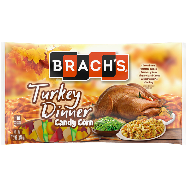 NEW to store shelves: A full course meal presented in a unique mix of candy corn flavors. BRACH’S Turkey Dinner includes all of the traditional Thanksgiving favorites. From roasted turkey, green beans and stuffing to ginger glazed carrots, cranberry sauce and sweet potato pie.