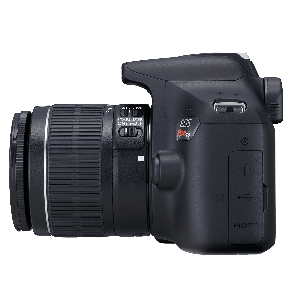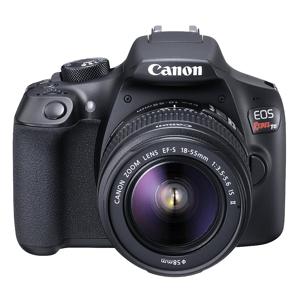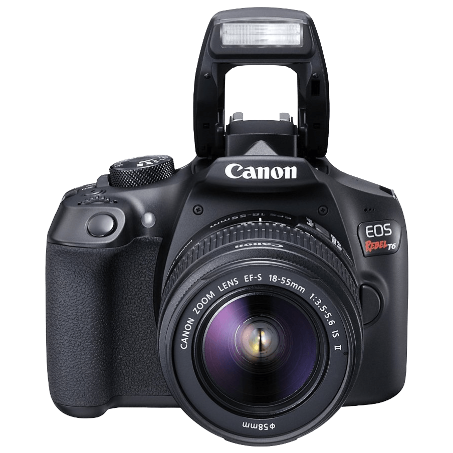 Specs ==== - Lens Mount: Canon EF, Canon EF-S - Camera Format: APS-C (1.6x Crop Factor) - Pixels (Actual): 18.7 Megapixel - Pixels (Effective): 18 Megapixel - Max Resolution: 17.9 MP: 5184 x 3456 - Aspect Ratio: 3:2 - Sensor Type / Size: CMOS, 22.3 x 14.9 mm - File Formats: JPEG, RAW, MOV, MPEG-4 AVC/H.264, Linear PCM - Bit Depth: 14-bit - Dust Reduction System: Yes - Memory Card Type: SD, SDHC, SDXC- Focus Control: - Focus Type: Auto & Manual - Focus Mode: Manual Focus (M), Single-servo AF (S) - Autofocus Points: Phase Detection:9, 1 cross-type- Viewfinder/Display: - Viewfinder Type: Pentamirror - Viewfinder Eye Point: 21.00 mm - Viewfinder Coverage: 0.95 - Viewfinder Magnification: Approx. 0.8x - Diopter Adjustment: - 2.5 to +0.5 m - Display Screen: 3" Rear Screen LCD (920,000) - Screen Coverage: 1 - Diagonal Angle of View: 170.0- Exposure Control: - ISO Sensitivity: Auto, 100-6400 (Extended Mode: 100-12800) - Shutter: 30 - 1/4000 second, Bulb Mode - Remote Control: RS-60E3 (Optional) - Metering Method: Center-weighted average metering, Evaluative metering, Partial Metering - Exposure Modes: Aperture Priority, Manual, Program, Program Shift, Shutter Priority - Metering Range: EV 1.0 - EV 20.0 - Compensation: -5 EV to +5 EV (in 1/3 or 1/2 EV steps)" - Continuous Shooting: Up to 3 fps at 18 MP for unlimited frames in JPEG format, Up to 3 fps at 18 MP for up to 6 frames in raw format - White Balance Modes: Auto- Flash: - Built-in Flash: Yes - Guide No.: 30.2’ (9.2 m) ISO100 - Max Sync Speed: 1 / 200 seconds - Flash Compensation: -2 EV to +2 EV (in 1/3 or 1/2 EV steps) - Dedicated Flash System: eTTL - External Flash Connection: Hot Shoe- AV Recording: - Video Recording: Yes, NTSC - Video Format: - 1920 x 1080p @ 29.97 fps (46 Mbps) or @ 23.98 fps (46 Mbps) - 1280 x 720p / 59.94 fps (46 Mbps) - 640 x 480p / 29.97 fps (11 Mbps) - Aspect Ratio: 16:9 - Exposure Control (Auto): Shutter Speed, Aperture, ISO - Exposure Control (Manual): Shutter Speed, Aperture, ISO" - Exposure Compensation: -3 EV to +3 EV (in 1/3 EV steps) - Video Clip Length: 1920 x 1080 = 29 min. 59 seconds- Performance: - Start-up Time: 0.1 seconds - Shutter Lag: 0.12 seconds - Self Timer: 10 seconds, 2 seconds - Connectivity: 2.5mm Sub-mini (2-Ring), HDMI C (Mini), Mini-USB, USB 2.0 - Wi-Fi Capable: Yes- Power: - Battery: 1x LP-E10 Rechargeable Lithium-ion Battery Pack, 7.4 VDC, 860 mAh - AC Power Adapter: DR-E10 and CA-PS700 (Optional)- Physical: - Dimensions (WxHxD): 5.1 x 4.0 x 3.1" - Weight: 17.1 oz - Lenses: | Focal Length:| 18 - 55mm | 75-300mm | | — | — | — | | Compatible Focal Length: | 28.8 - 88 mm | 120-480 mm | | Maximum Aperture: | Maximum: f/3.5 - 5.6 | Maximum: f/4 - 5.6 | | Minimum Aperture | Minimum: f/22 - 38 | Minimum: f/32 - 45 | | Angle of View: | 74 20’ - 27 50’ | 32 11’ - 8 15’ | | Minimum Focus Distance: | 9.84" (25 cm) | 4.92’ (1.5 m) | | Magnification: | 0.34x | | | Elements/Groups: | 42683 | 13/9 | | Autofocus: | Yes | Yes | | Image Stabilization: | Yes | No | | Filter Thread: | Front: 58 mm | Front: 58 mm | | Dimensions (DxL): | Approx. 2.70 x 2.80" (68.5 x 71.1 mm) | Approx. 2.80 x 4.80" (71 x 122 mm) | | Weight: | 7.09 oz (201 g) | 1.06 lb (480 g)| Full Manufacturer specsWhat’s in the Box? ====1x EOS Rebel T6 Body1x EF-S 18-55mm f/3.5-5.6 IS II1x EF 75-300mm f/4-5.6 III1x EOS Shoulder Bag 100ES1x Battery Pack LP-E101x Battery Charger LC-E101x Eyecup Ef1x Interface Cable IFC-130U1x Wide Strap EW-400DPictures====CameraLensZooooomFlashLeft sideRight sideTop sideScreen sidePie sidePrice Comparison====$749.99 List, $449 at AmazonFind a relevant price comparison? Please share it in a comment in this thread