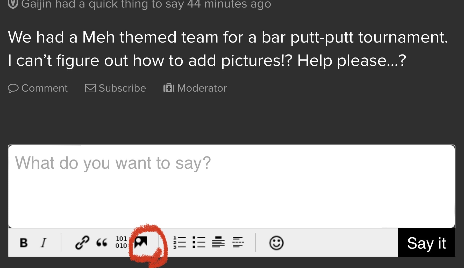 We had a Meh themed team for a bar putt-putt tournament. I can’t figure out how to add pictures!? Help please…?
