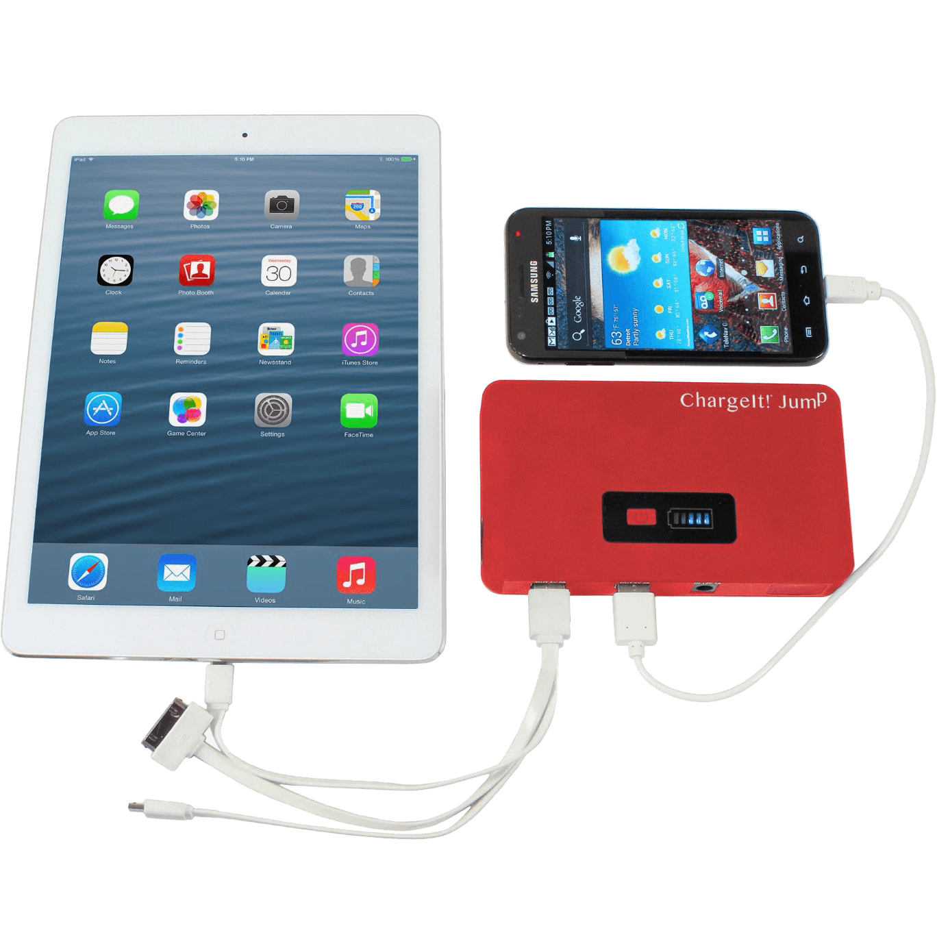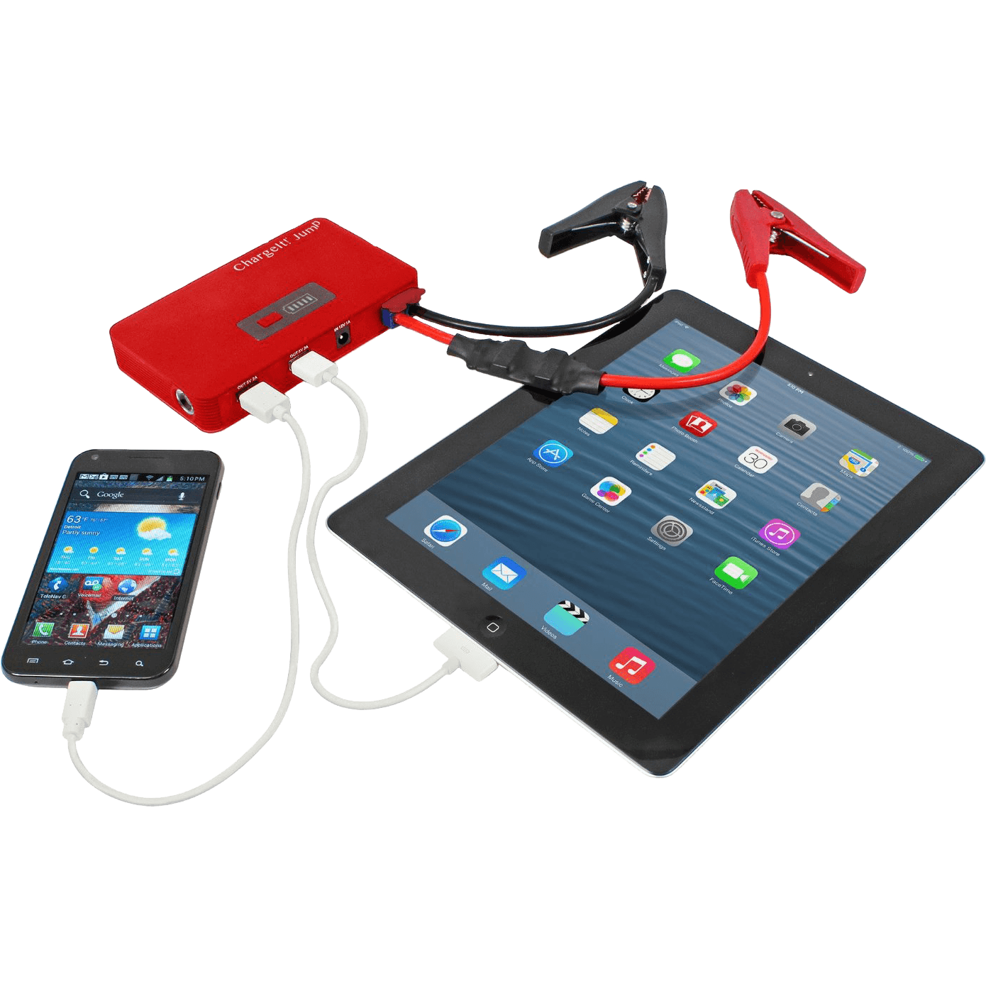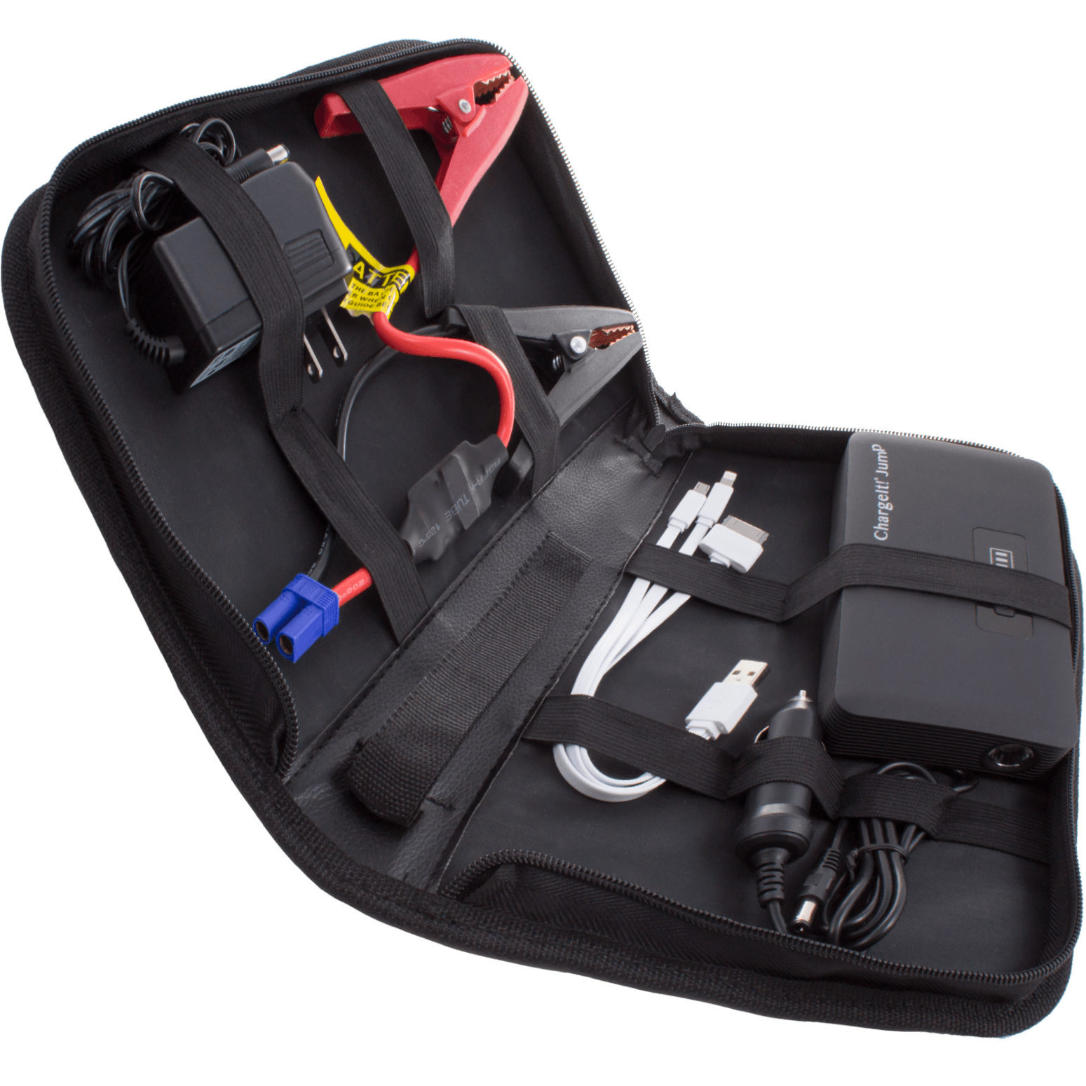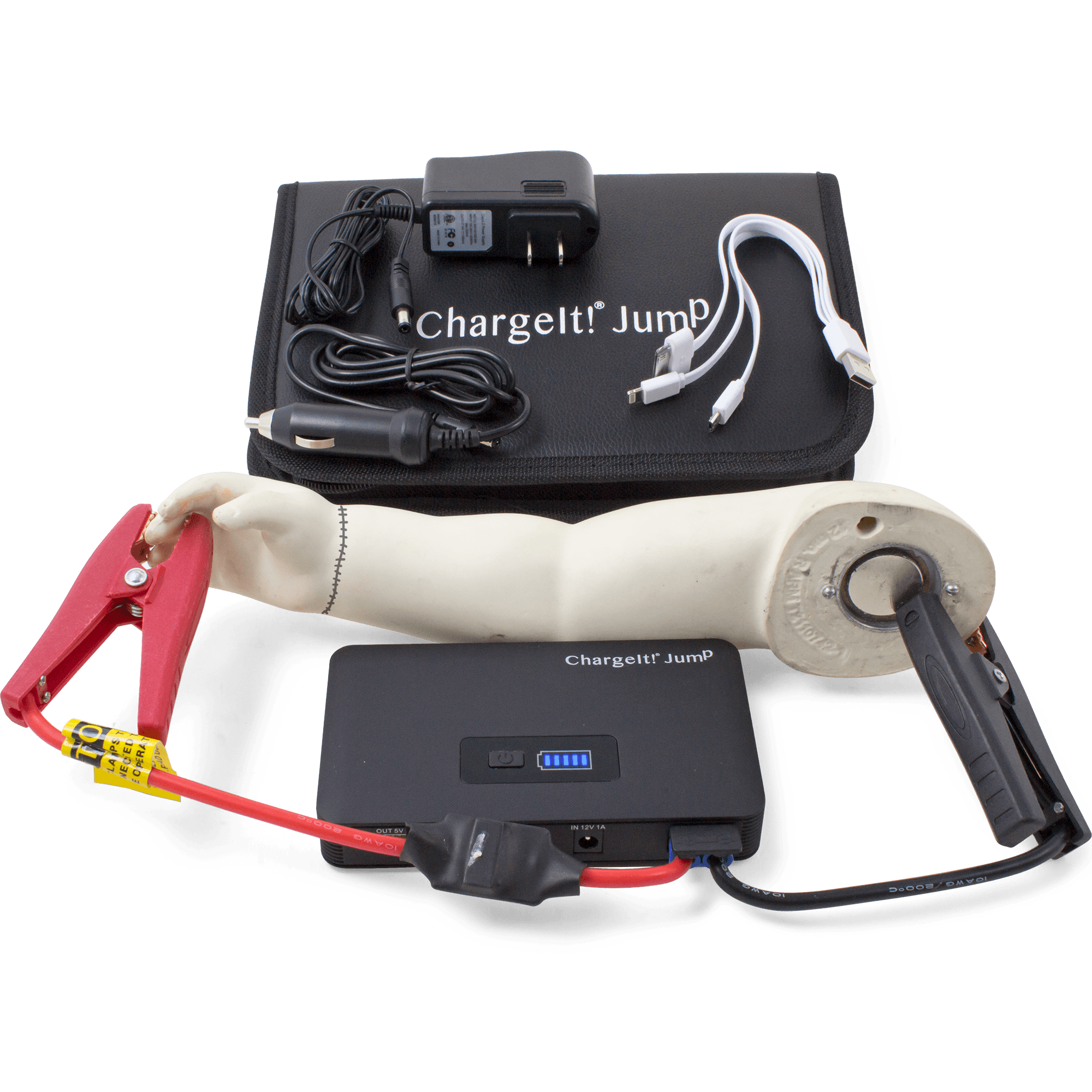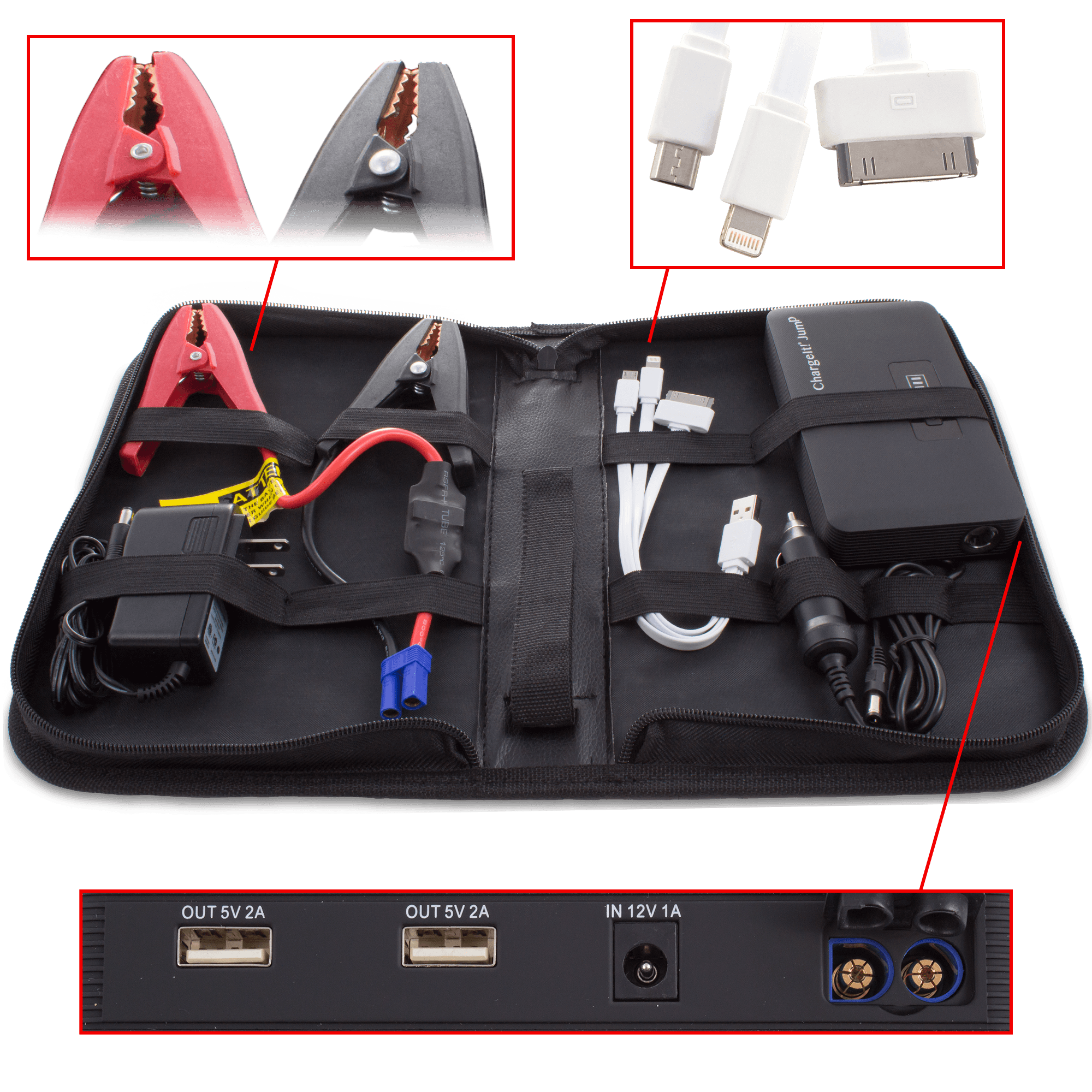 Specs====- Model: 9597- Model: 9599- 7500 mAh Rechargeable Lithium Polymer Battery- 200 amp starting current, 400 amp peak current- Battery rated for 500 cycles - Input DC2.5 12V/24V 1A - Output DC3.5 12V/2A- 12 Volt Jumpstart port- Jumpstart Starting Current from 200A to 400A- Heavy Duty Jumper Cables with protective tips- 2x 5V/2A USB ports- Micro USB, 8-Pin Lightning, and 30-pin three-headed charger cable- Large Flash Light in 3 modes for emergency w/SOS- LED Power Indicator- Over-current, short circuit, overload, over-voltage, and over-charge protection- Made in ChinaCondition: NewWarranty: 1 Year Limited ChargeIt!Estimated Delivery: 12/30 - 1/3Shipping: $5 or free with VMP What’s in the Box?====- ChargeIt battery- Wall charger with cable- Cigarette lighter charging cable- Fabric carrying case- Jumper cables with protective tipsPictures====Details of the contentsCaseOpenedRetail boxBlack batteryRed batteryCharging stuffCharing more stuffNot recommended usagePrice Check====$119.95 List, $102.82 at Amazon$100 at Rakuten