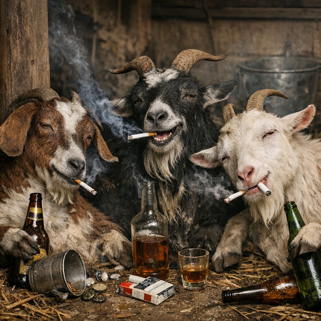 @Kyeh Here’s the image you requested for “realistic drunk goats smoking”