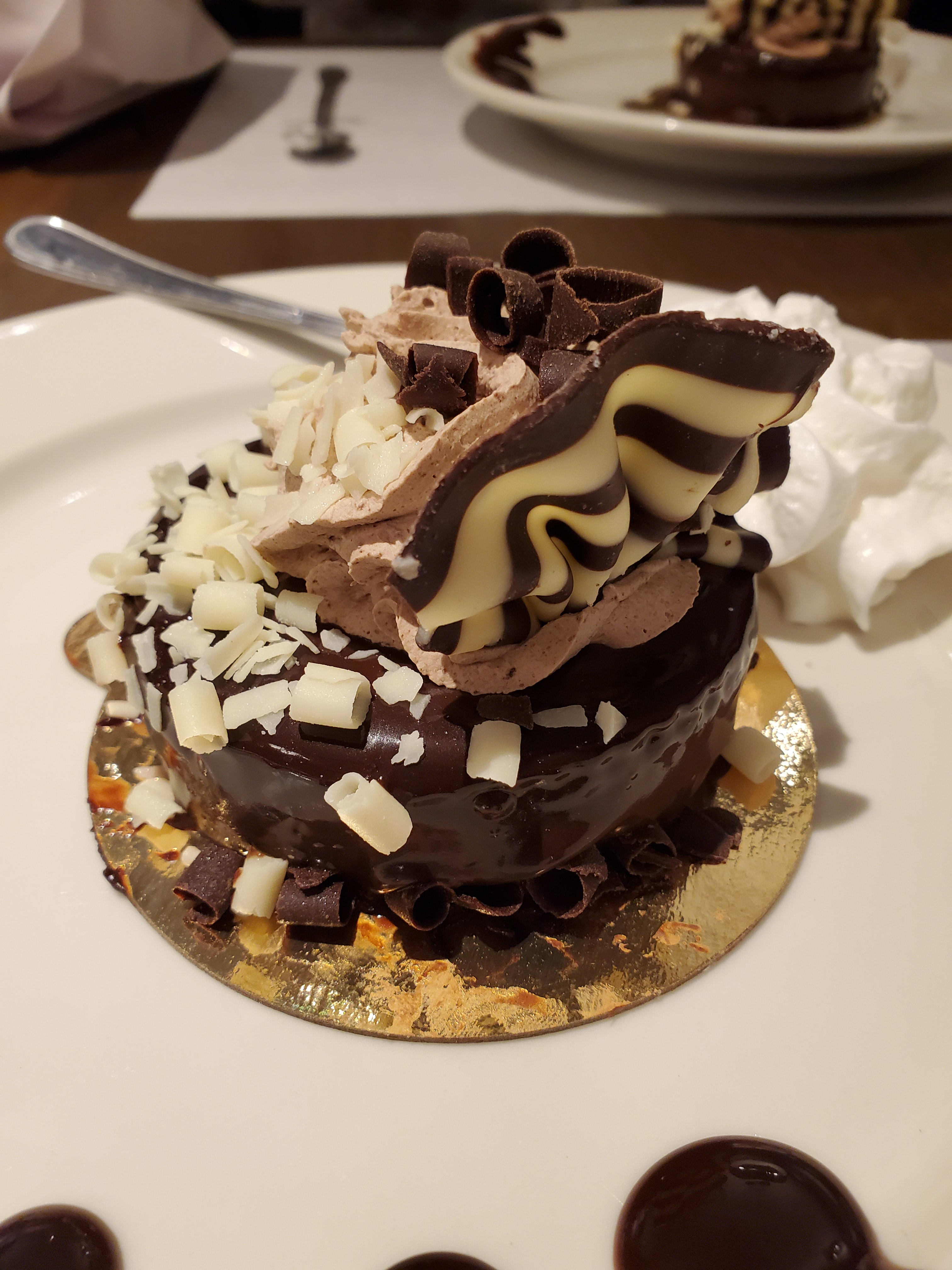 I forgot about this little gem. Cheesecake enrobed in ganache, topped with mousse and chocolate ribbons. Awesome.