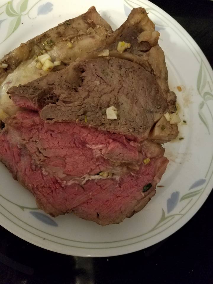 Tried my first sous vide beef rib roast. This was a single rib, finished in a hot oven to brown it. Need to work on the crust, but inside is perfect, juicy and tender.