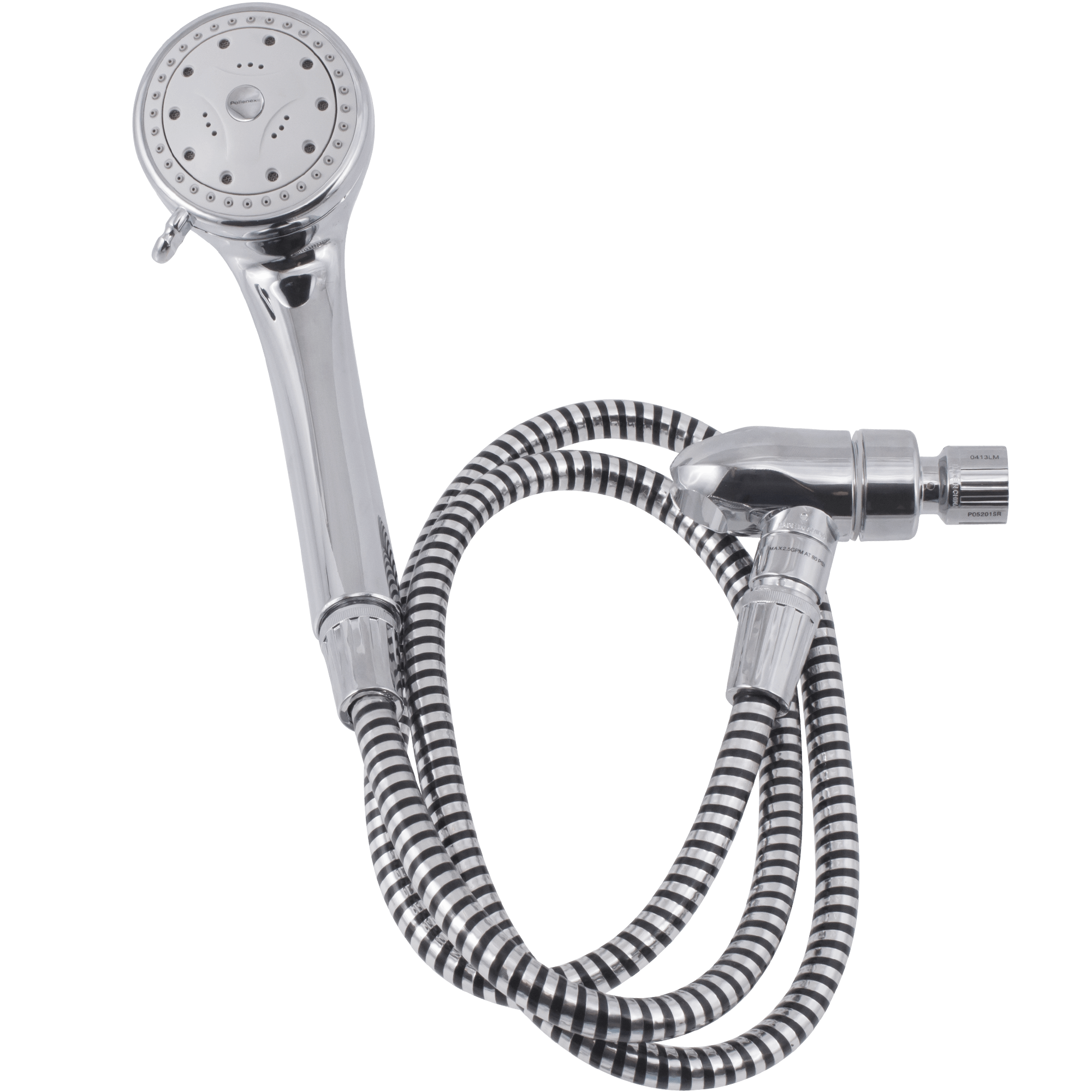 Specs ====- Model: PO5201SR- Chrome finish- 5 modes: Full body, light spray, dual jet massage, aerated, and pause spray (to save water while shampooing)- Anti-clog rubber nozzles- 5 foot tangle-free PVC hose- Water flow: 2.5 GPM (gallons per minute)- Meets ANSI standard A112.18.1- User manualCondition: NewWarranty:5 Year PollenexEstimated Delivery: 7/24 - 7/28Shipping: $5 or free with **VMP**What’s in the Box?====1x Showerhead1x Hose1x Arm bracket1x Teflon tape rollPictures ====Hooked upHandleHose wrapped upRetail packagingFive settings!Price Comparison====$51 at AmazonFind a relevant price comparison? Please share it in a comment in this thread