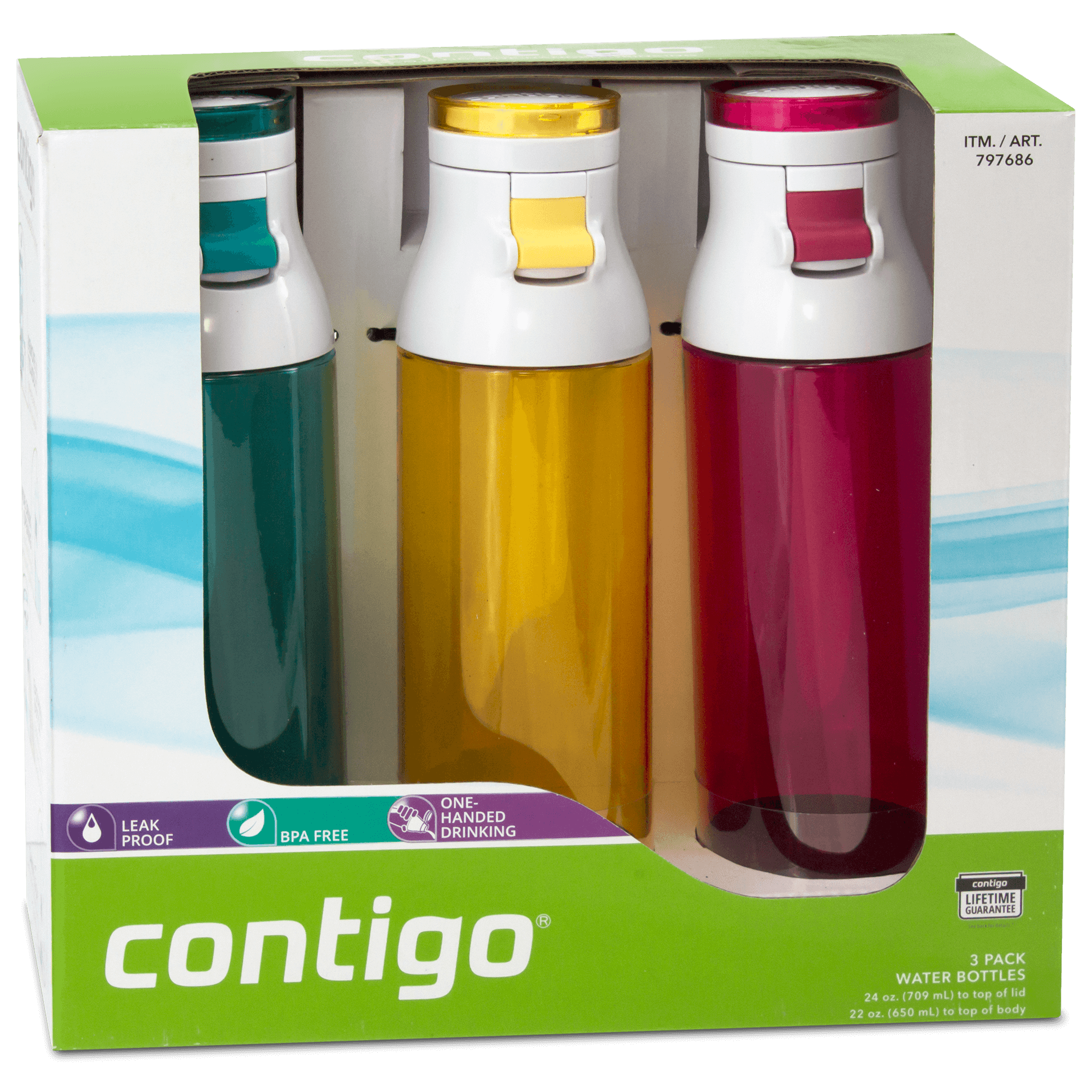 Specs ====- Model: JKG100A01- Volume: 24 oz.- Dimensions: 9.5 x 2.5"- Material: BPA-Free Plastic- Top-rack dishwasher safe- Split body design for easy cleaning- Leak-proof lid- Carrying loop- One-handed drinking- Fits most car cup holdersCondition: NewWarranty: Lifetime ContigoEstimated Delivery: 7/25 - 7/28Shipping: $5 or free with **VMP**What’s in the Box?====3x Contigo Jackson water bottlesPictures ====Retail packaging3 BottlesCarrying loopHarrisonsPrice Comparison====$19.99 at AmazonFind a relevant price comparison? Please share it in a comment in this thread