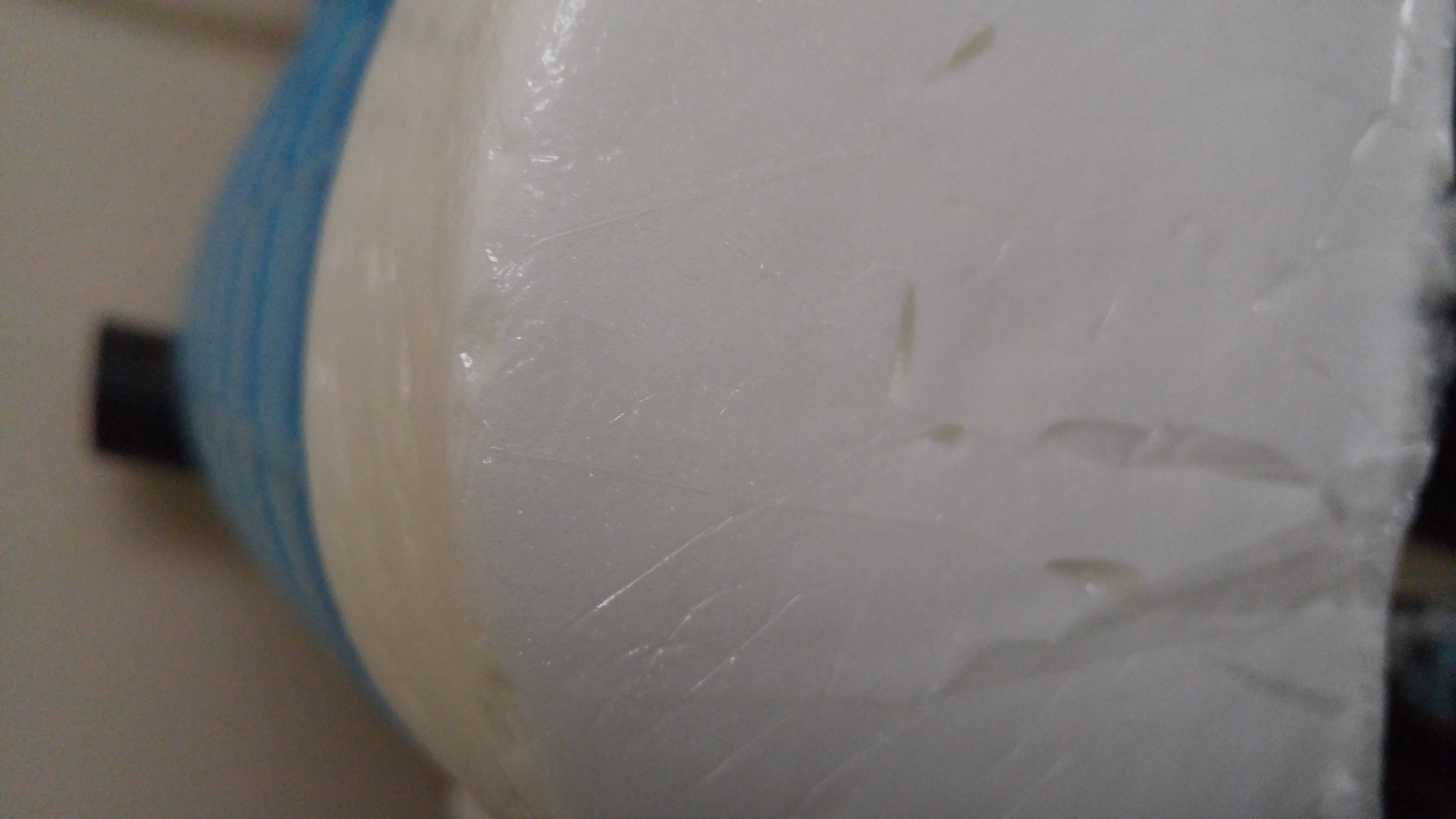 First of all, there’s some sort of Saran Wrap plastic stuck to the whole thing. It doesn’t look like an accident; it looks like, rather than putting a cover on the foam pillow, they just sprayed it into a mold with the Saran Wrap and let it be stuck there. It stinks to high heaven. In addition, there must have been a problem with the shipping, because it looks like the post office had to repackage it- the box is covered in “repacked by USPS” tape.