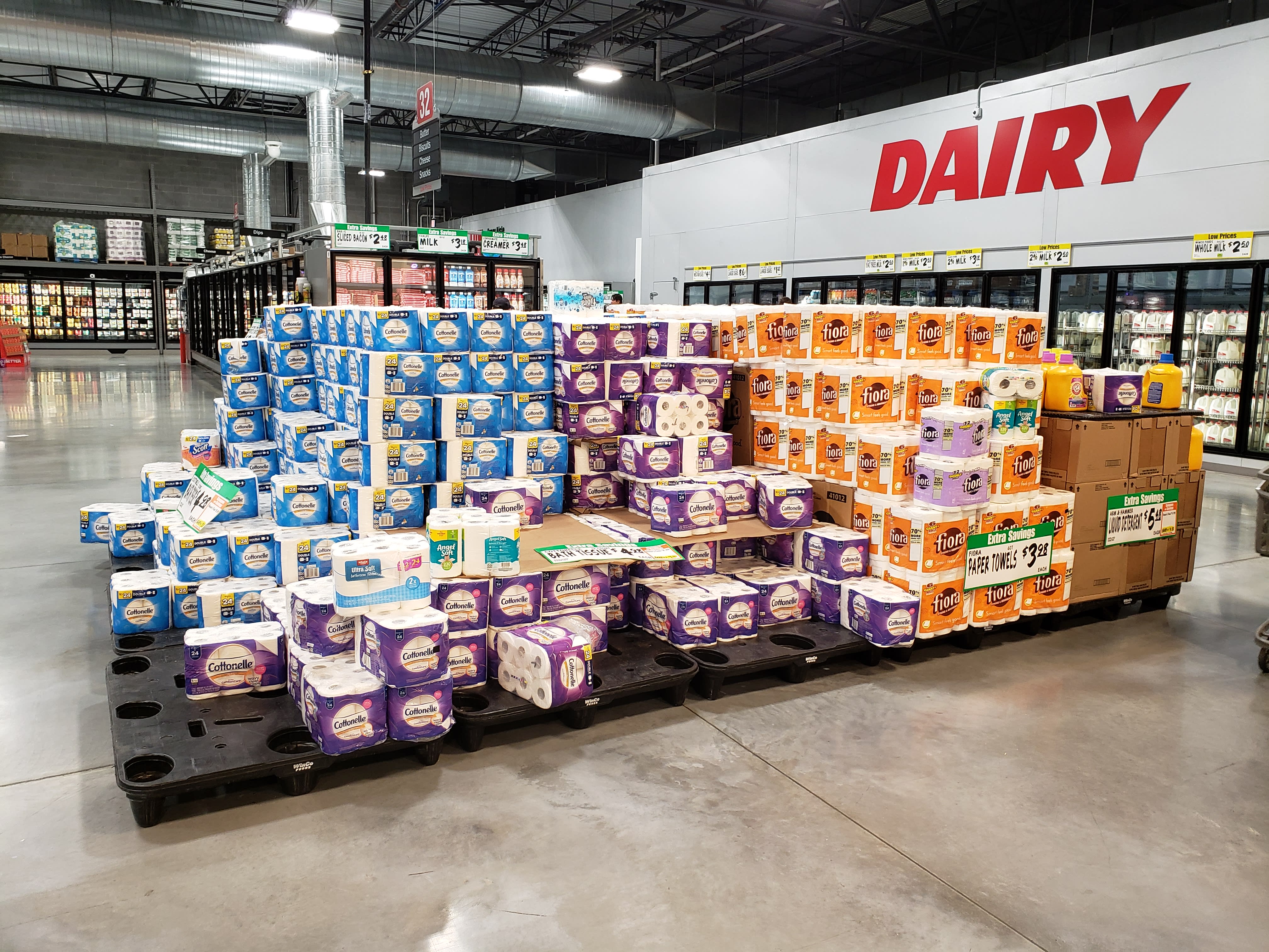 As of yesterday (Friday), the Casey’s I work at still had quite a few packages of TP on the shelves. They’re only 4-packs and the single mega rolls, but something is better than nothing if you need it. It’s my weekend off so IDK how much we’ll have left Monday (although today was a grocery day).