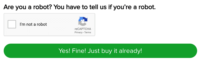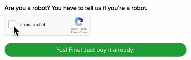 @sicc574 Right above the “Yes! Fine! Just buy it already” green button was a checkbox. You need to put a check in that box first. It will ask you a couple challenge questions usually based on some images to prove you’re really a human. Did you go through that or did you just ignore the checkbox and go right to the green button?
