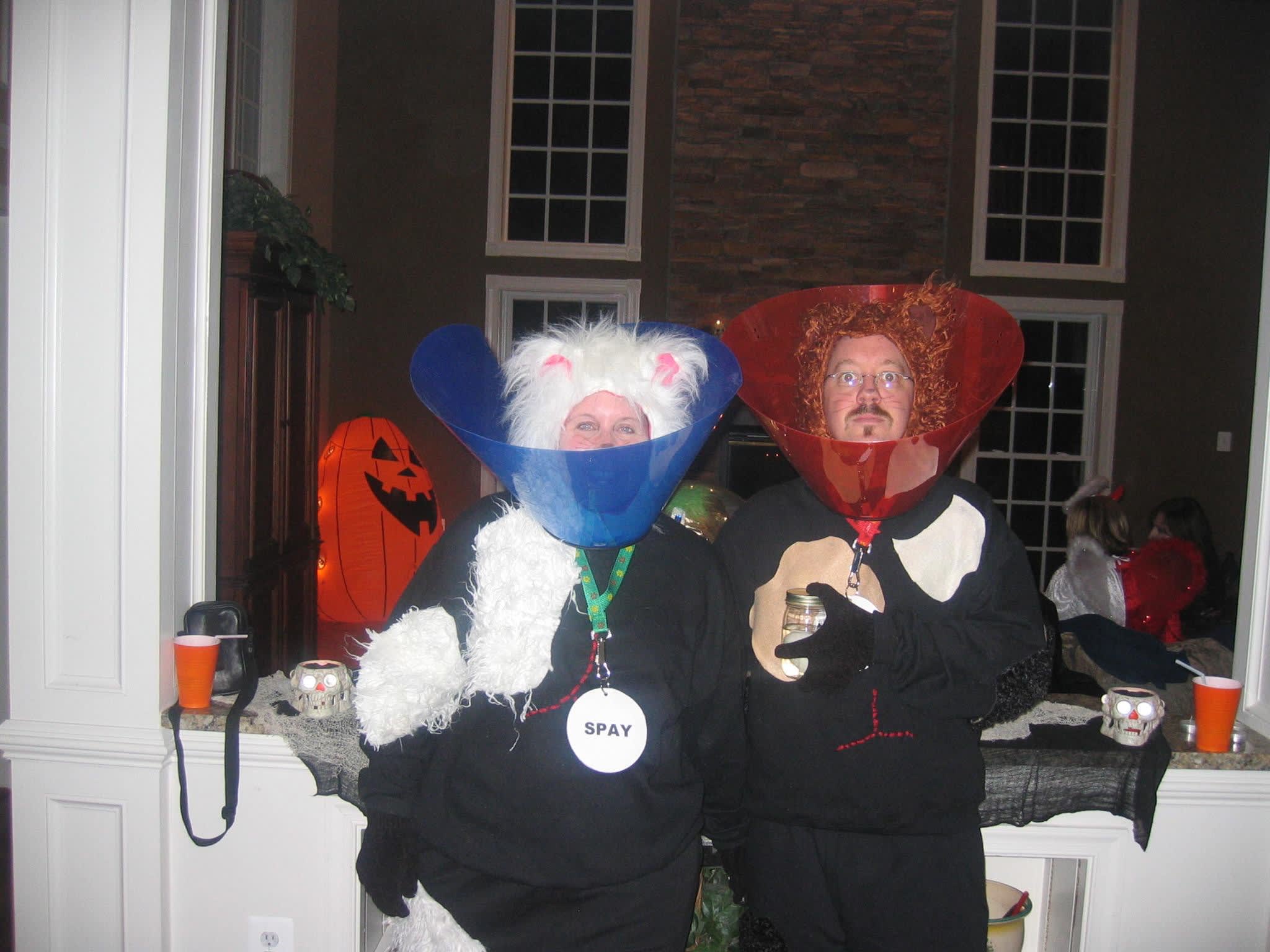 The wife & I went as Spayed & Neutered a few years back. (Deviled eggs in the jar I carried around) Cones of shame seemed like a good idea, until we tried to drink with ‘em on.