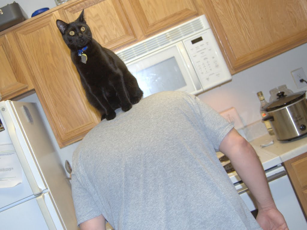 My cat Milton used to jump on our backs if we bent over for something. One time my husband decided to stand back up very slowly to see what Milton would do…