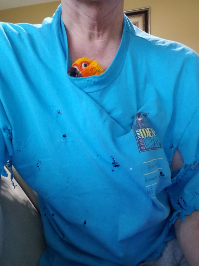 My bird likes spending time inside my shirt chewing his way out. Puts lots of holes in the shirt so I have a stack of “retired” ones that I wear when I’m with him.
