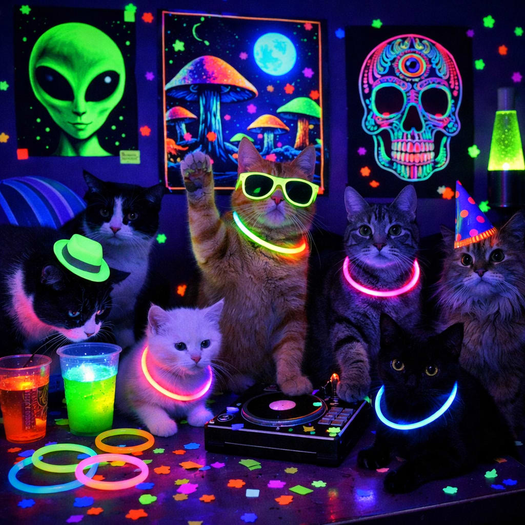 /showme real cats partying in a room with Blacklights & fluorescent posters
