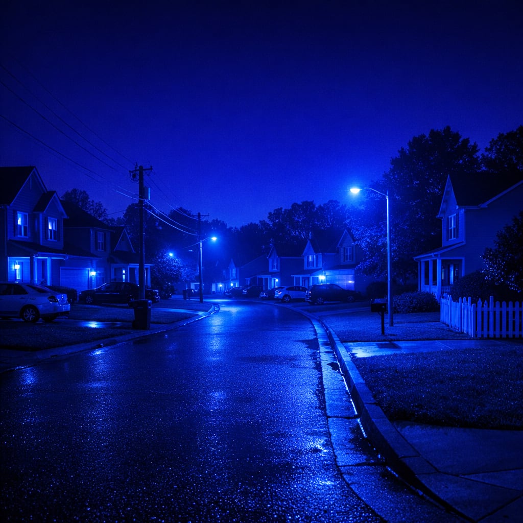 @yakkoTDI Here’s the image you requested for “a neighborhood lit by only blue lights”