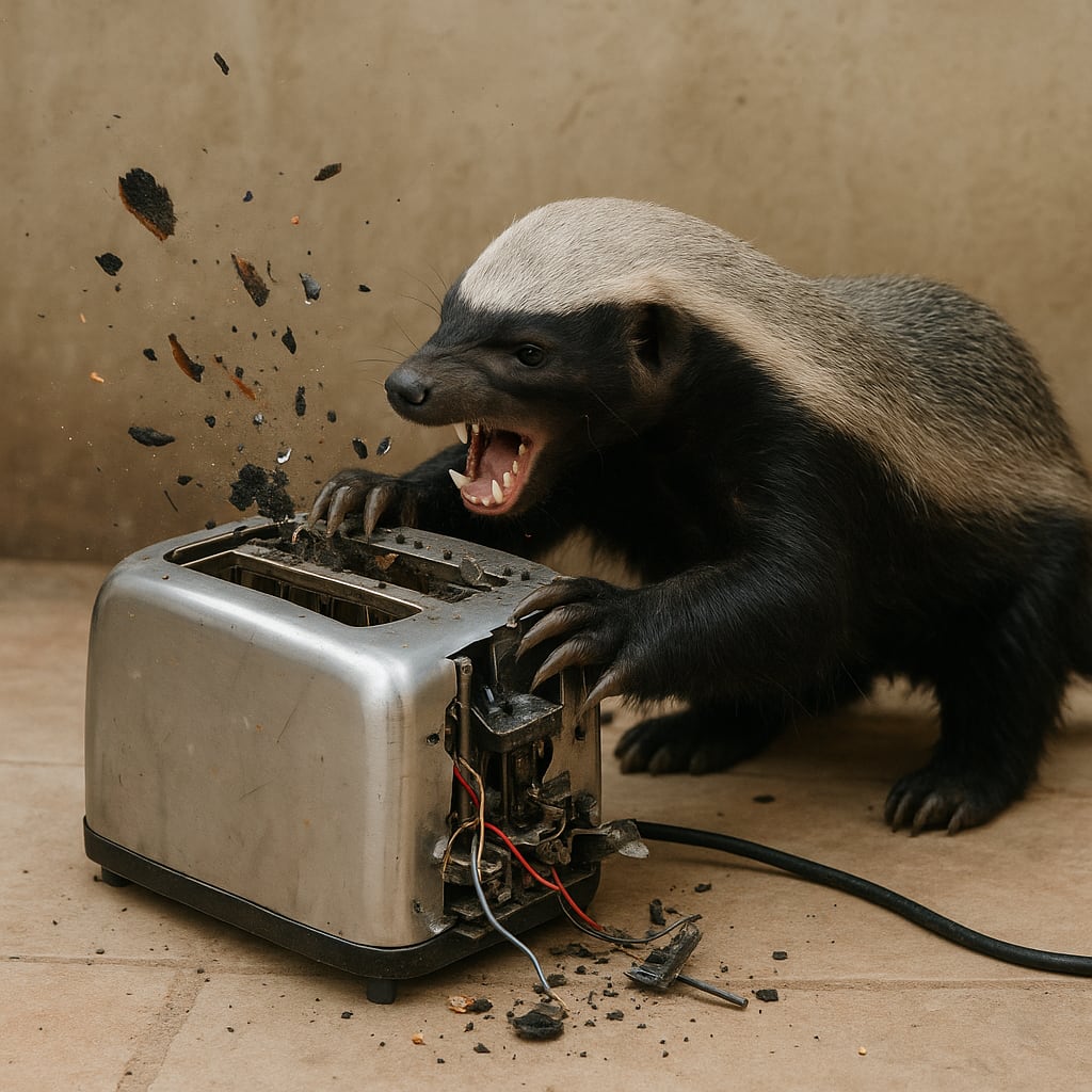 /showme a Drunk Cat holding a metal fork that is angry about a toaster and is yelling loudly that it’s just AI Garbage!