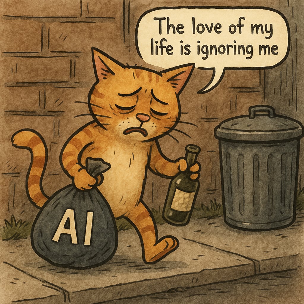 /showme a drunk cat taking out the AI garbage while lamenting that the love of his life is ignoring him