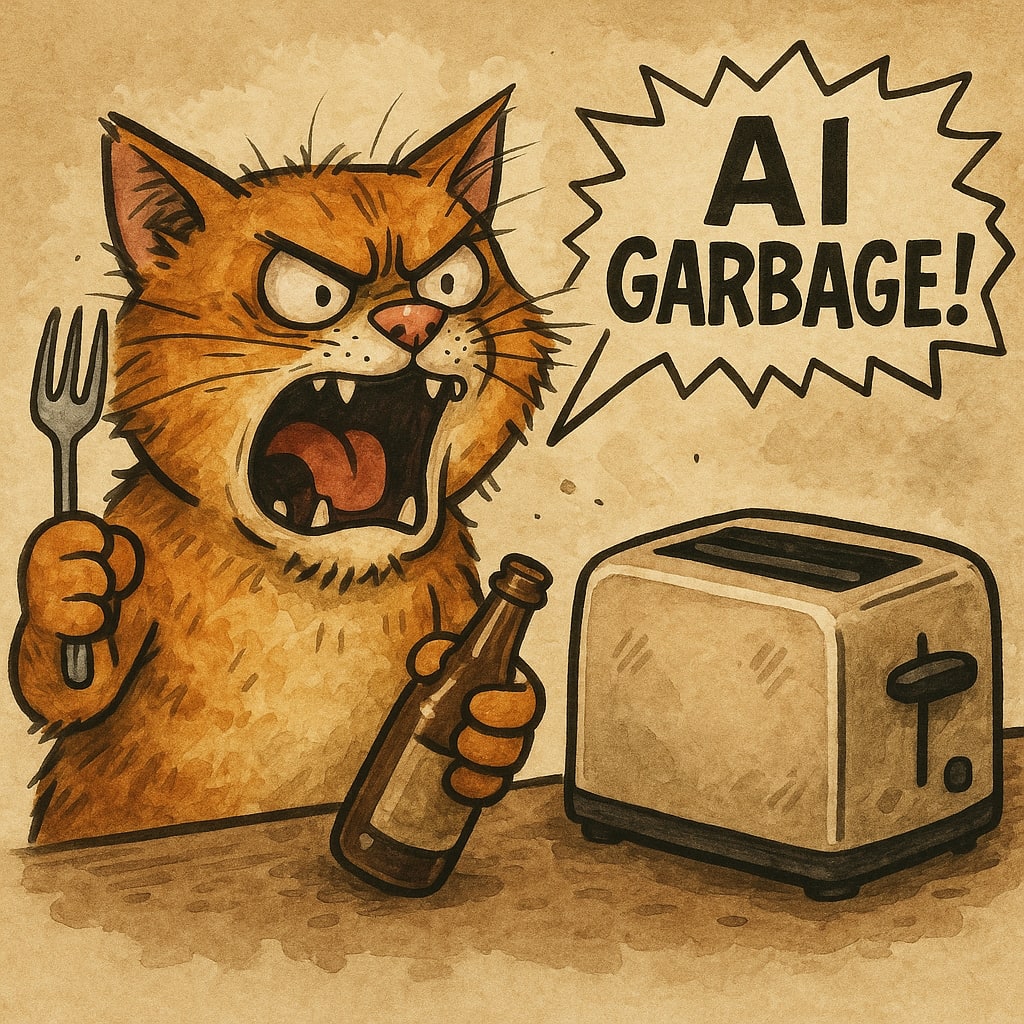 /showme a Drunk Cat that is angry about a toaster and is yelling loudly that it’s just AI Garbage!