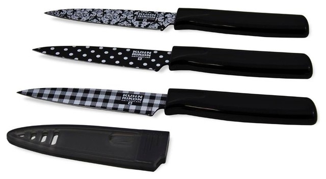 Hmmm. I have a few high carbon utility knives (Opinel and Tojiro) that require much different care than a typical kitchen knife. They must be kept dry or they will rust. I even wipe them dry while I'm cooking if they're not being used at that moment. Their advantage is that they are very easy to sharpen and take a great edge. This Cuisinart set has a non-stick coating which may protect most of the blade but not the edge. So...meh.