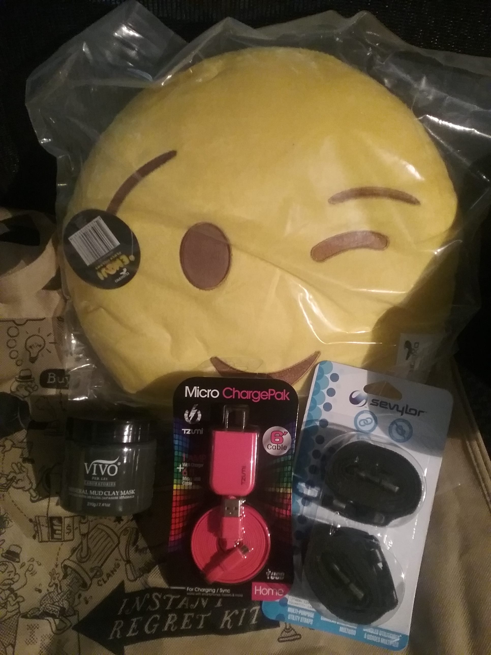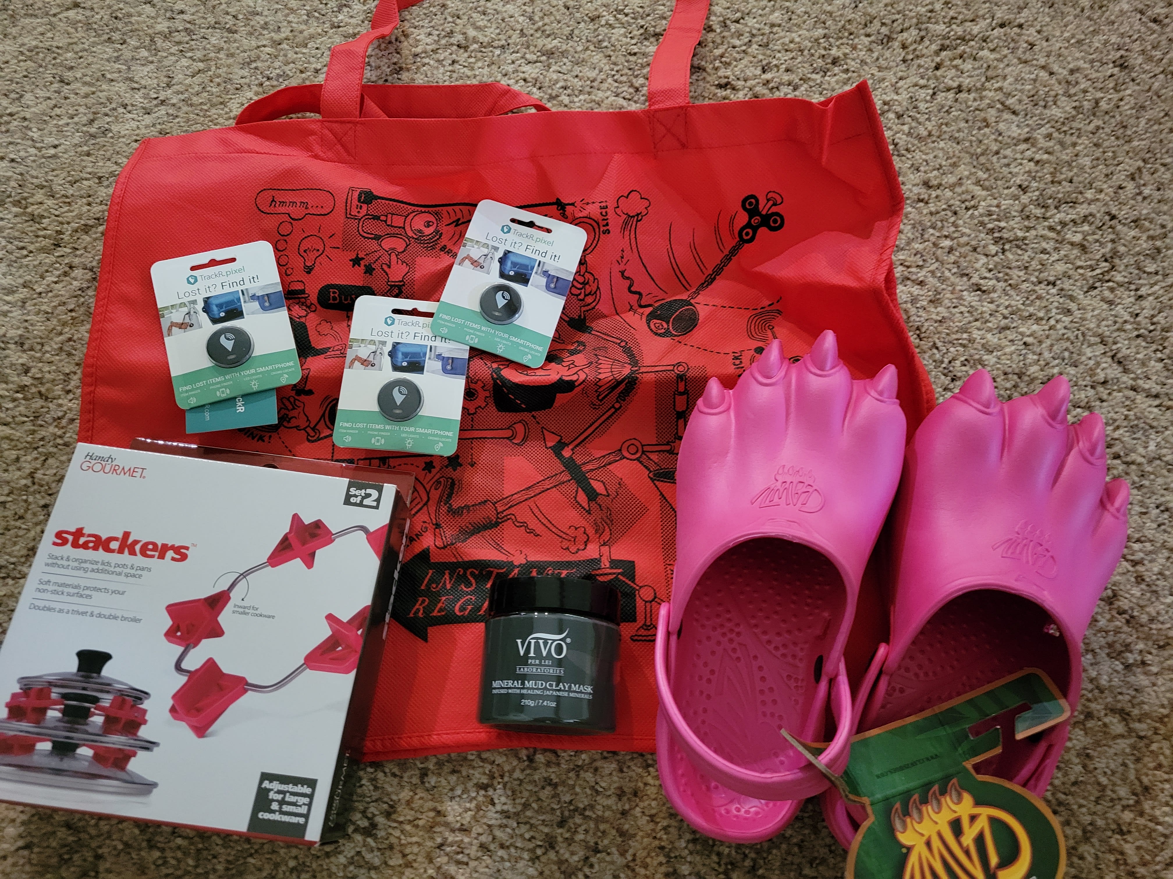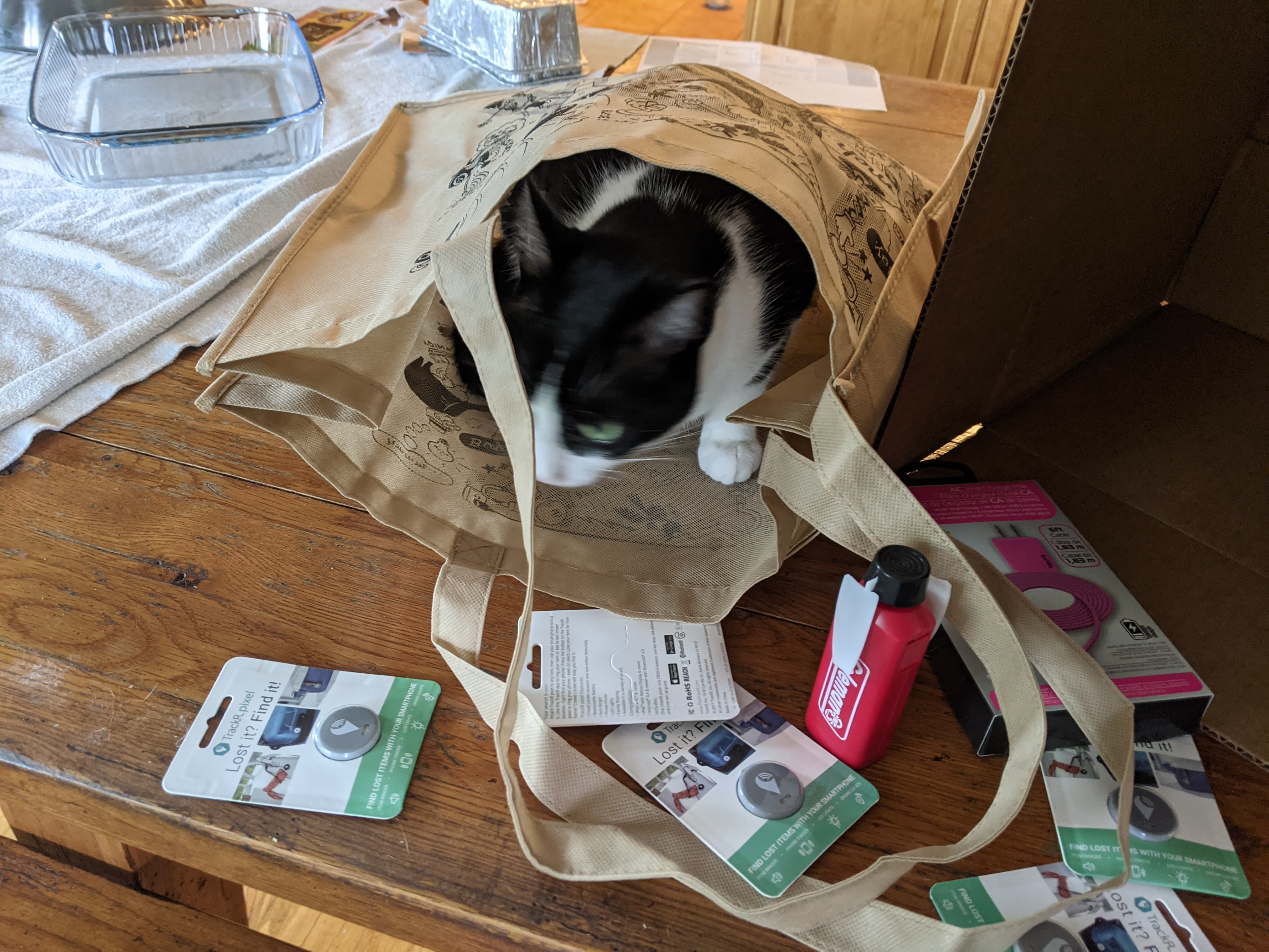 They sure fooled me. I was expecting masks and Trackrs. Not bad, though, a micro USB charger, putty, a keychain flashlight, tan bag, and what looks like a pretty decent mug. Primula brand, if it drinks well I am more than happy.