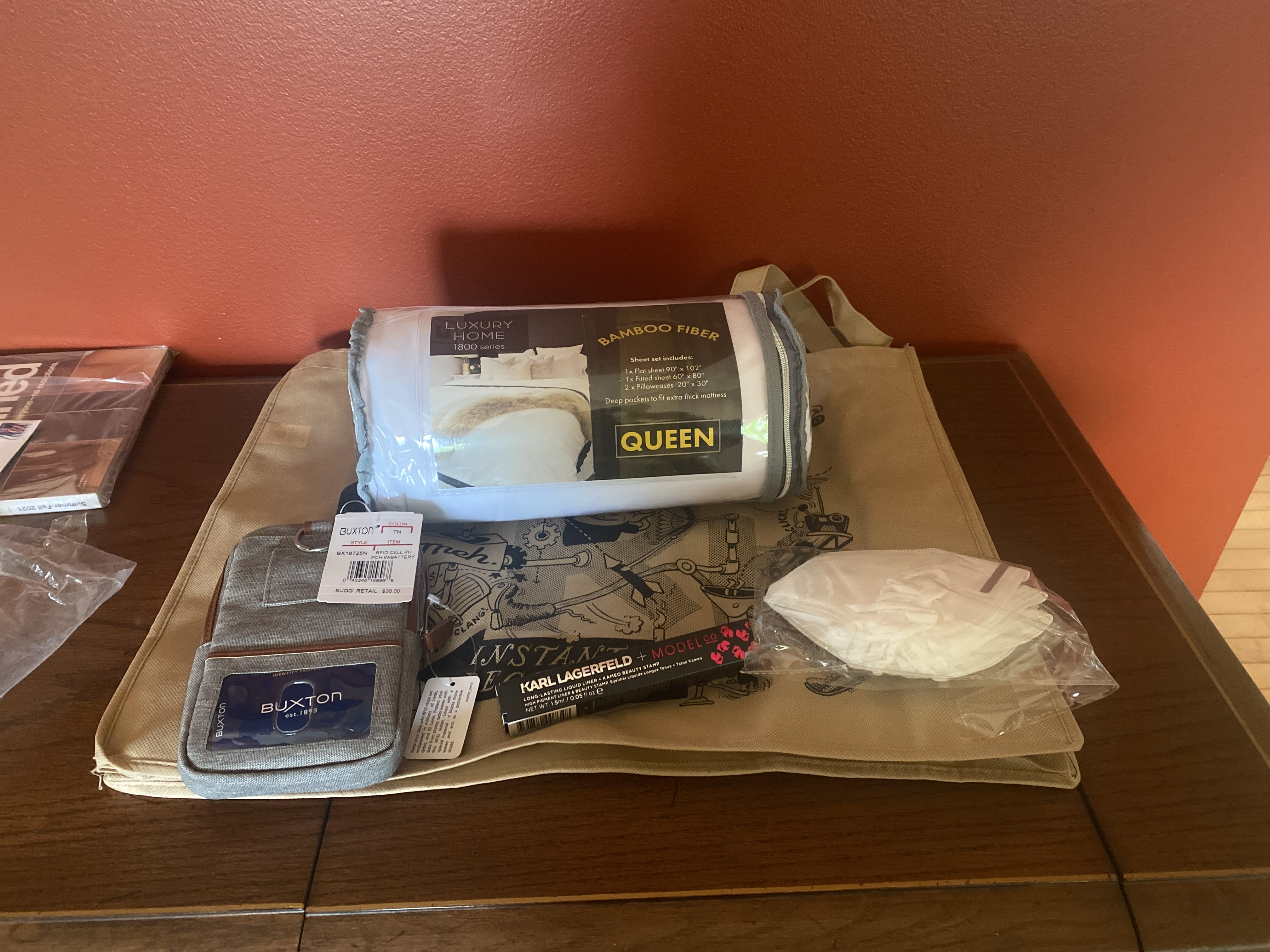 Best irk yet! I got a king bed coverlet, earbuds, a mini jewelry box and utility straps. All came with a beige bag. We are getting ready to makeover our bedroom so the coverlet was a nice surprise