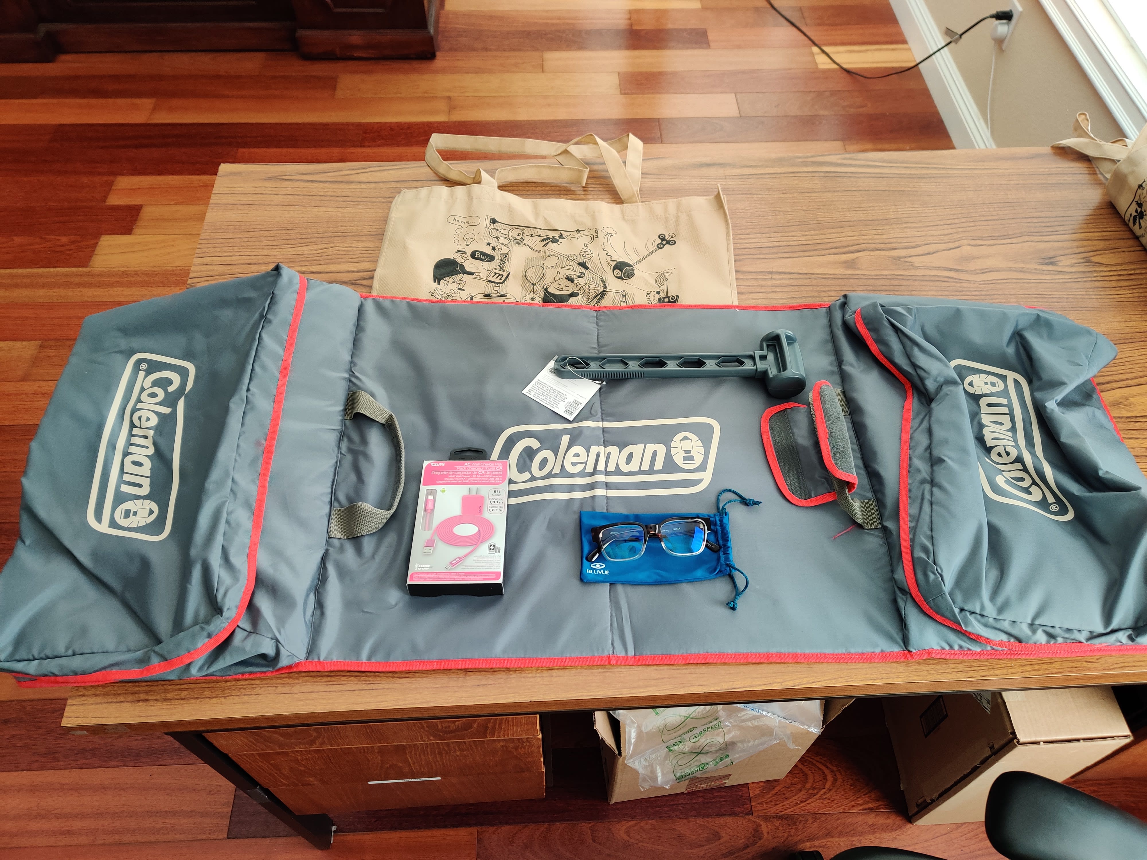 1x Coleman no idea but looks like some sorta seat cover with saddle bags (maybe to put on a cooler?)
