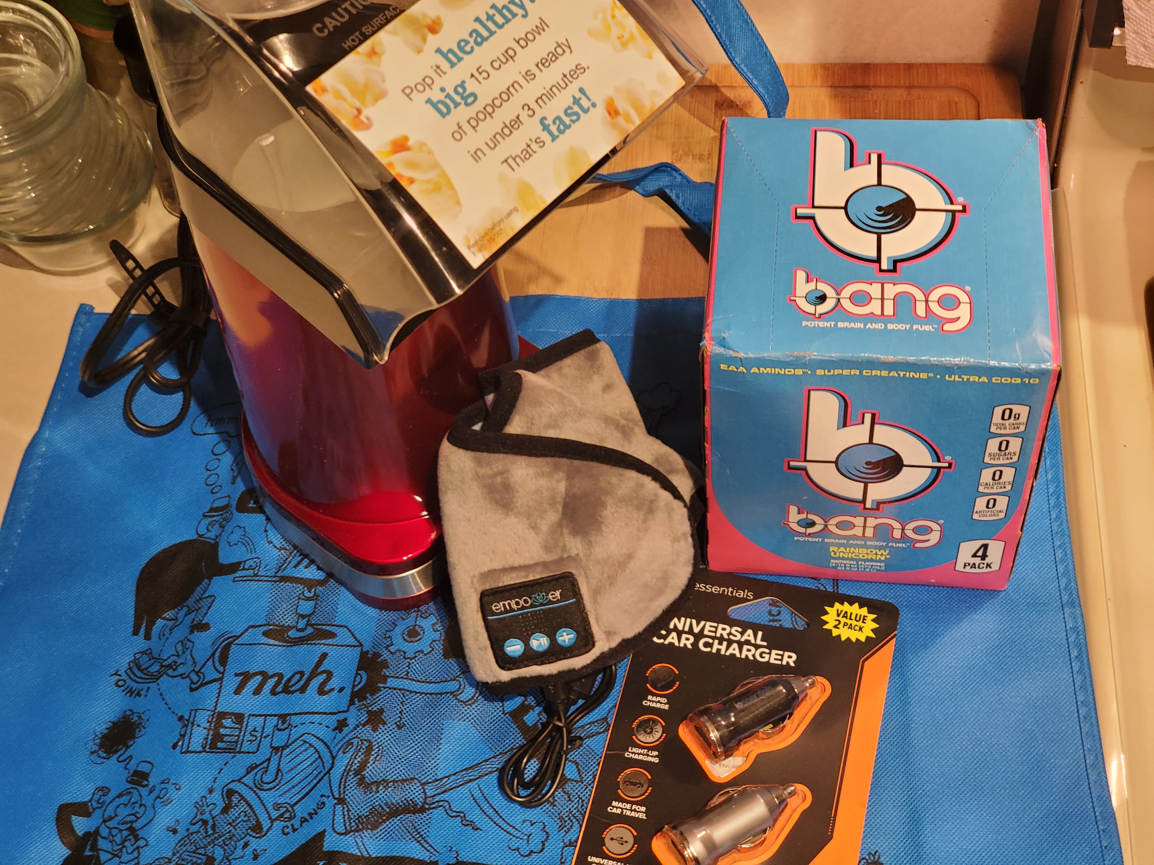 Received a cuisinart hot air popcorn popper, energy drinks, more car chargers (you actually can have enough if these), Bluetooth eye mask and a blue bag. It’s not an air fryer but an air popper. Lol