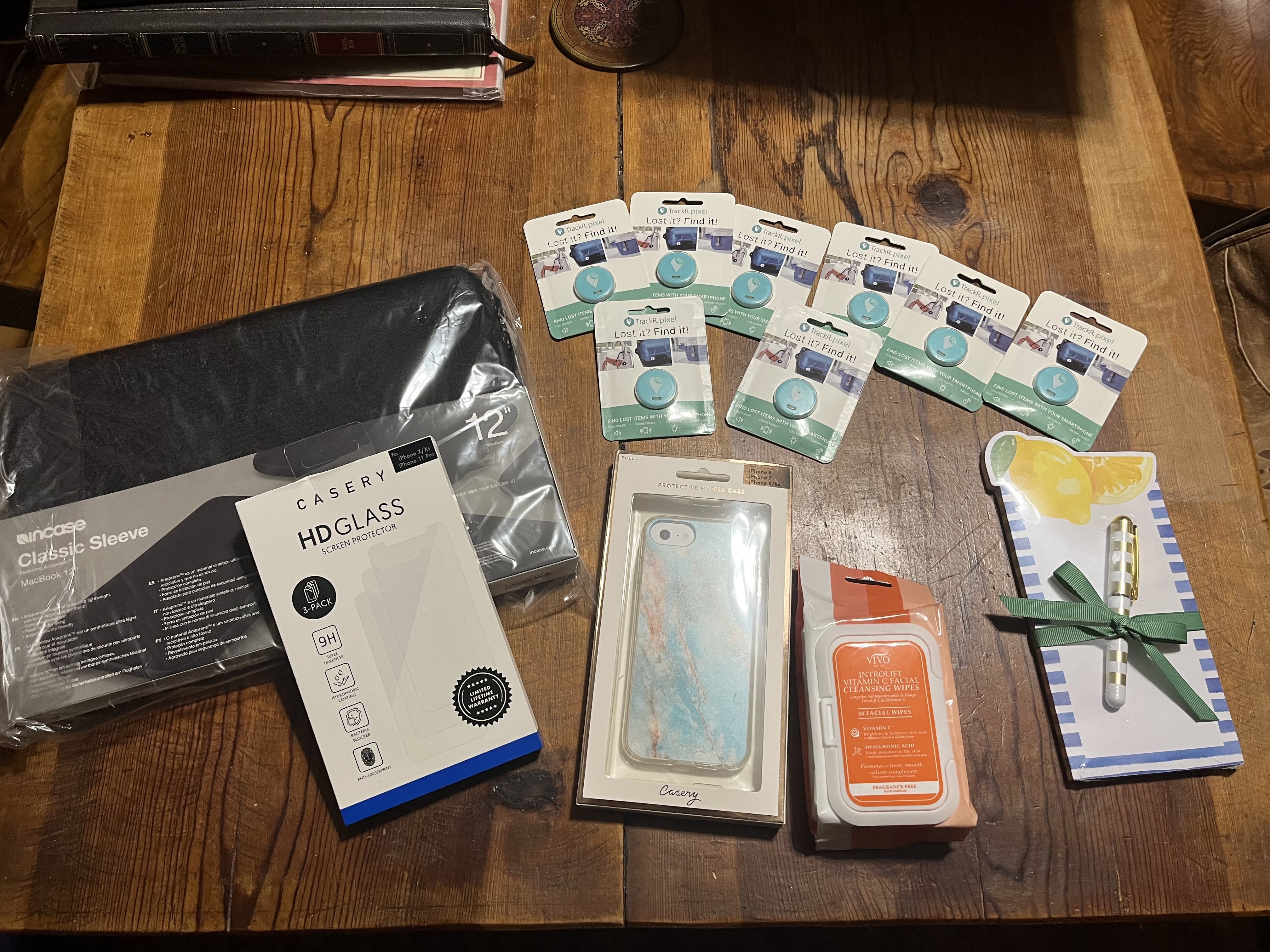 Cool card game to play with the grandson, new pixals, which I’ve been looking for, iphone case and cover for my sister, makeup remover, perfect for traveling, and good ol red meh bag.