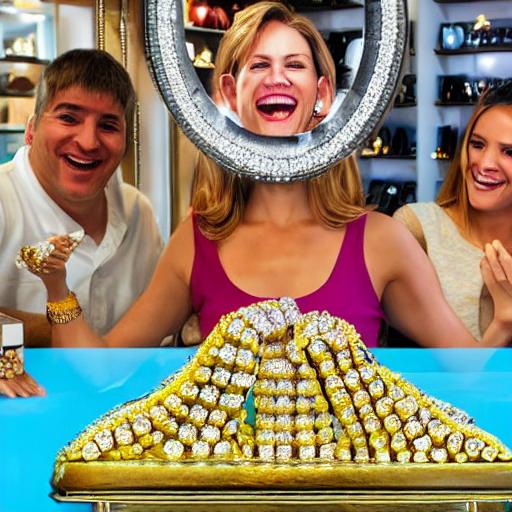 /showme lab-created diamonds on top of a scale made of bananas, lady wearing real diamonds watching and laughing, in a jewelry shop