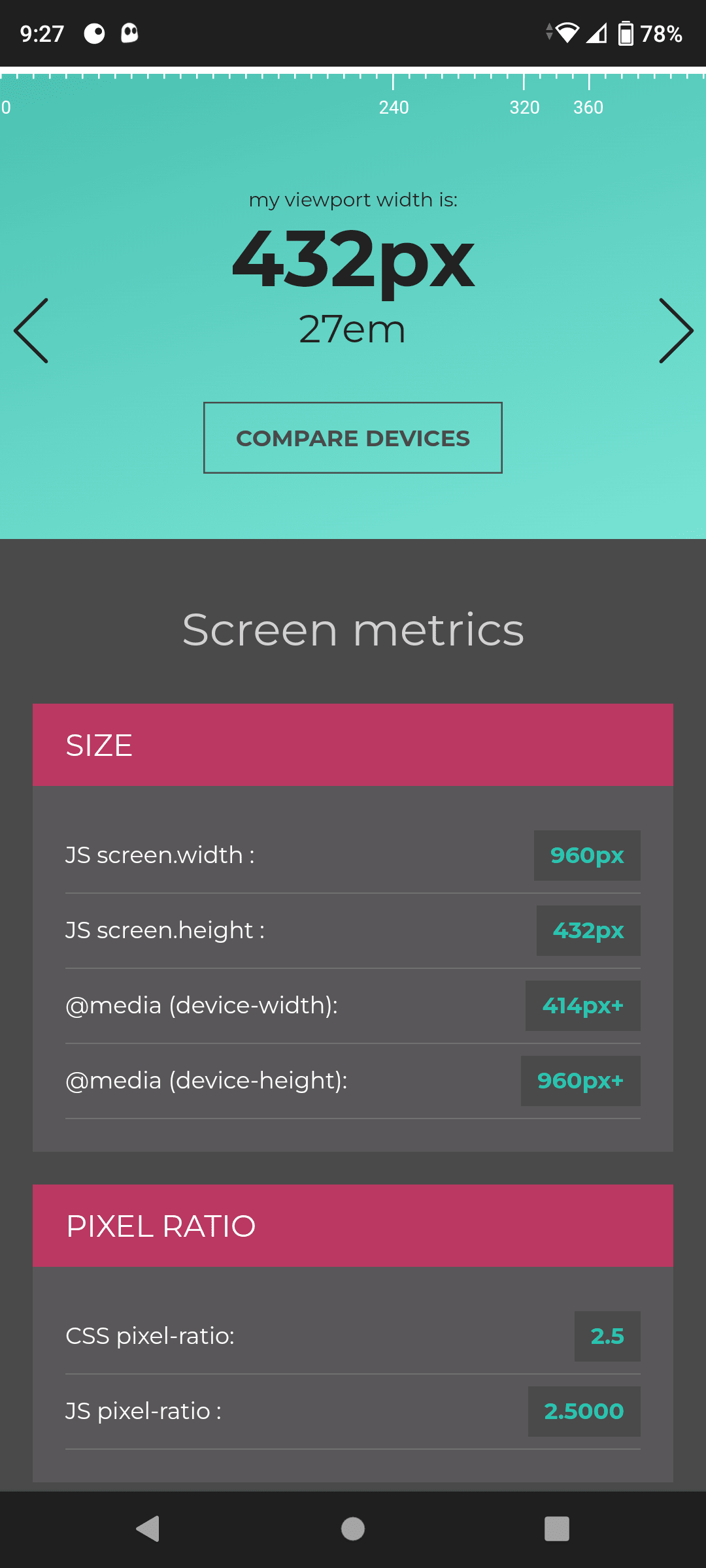 Since then, in the war for the largest screens and pixel densities, my HMD Nokia X100 goes “one louder” to 432 pixels, and falling into the website style code treating my phone as a desktop which doesn’t have pinch/zoom or other autoscaling features that mobile and tablet devices have with different screen sizes and ratios.
