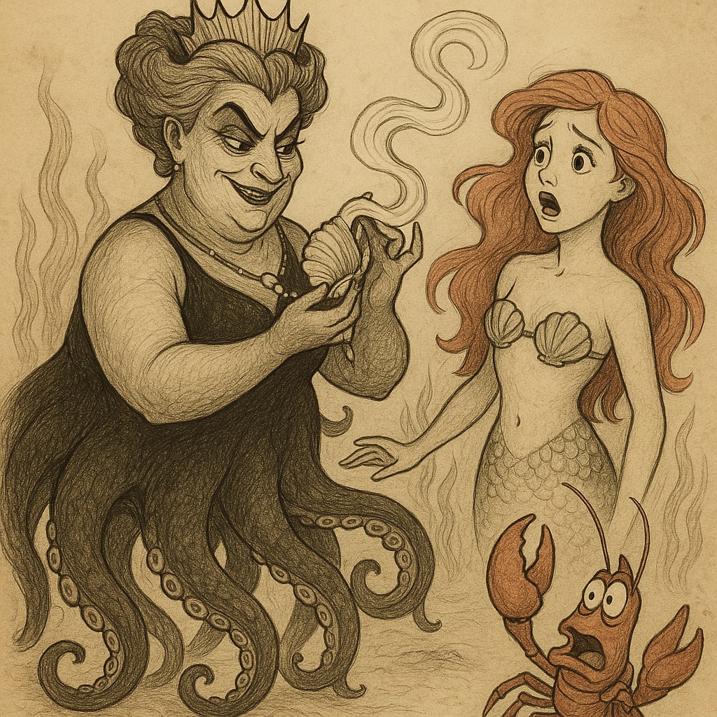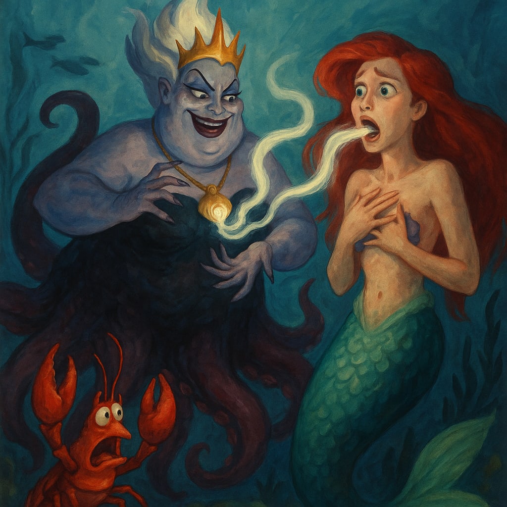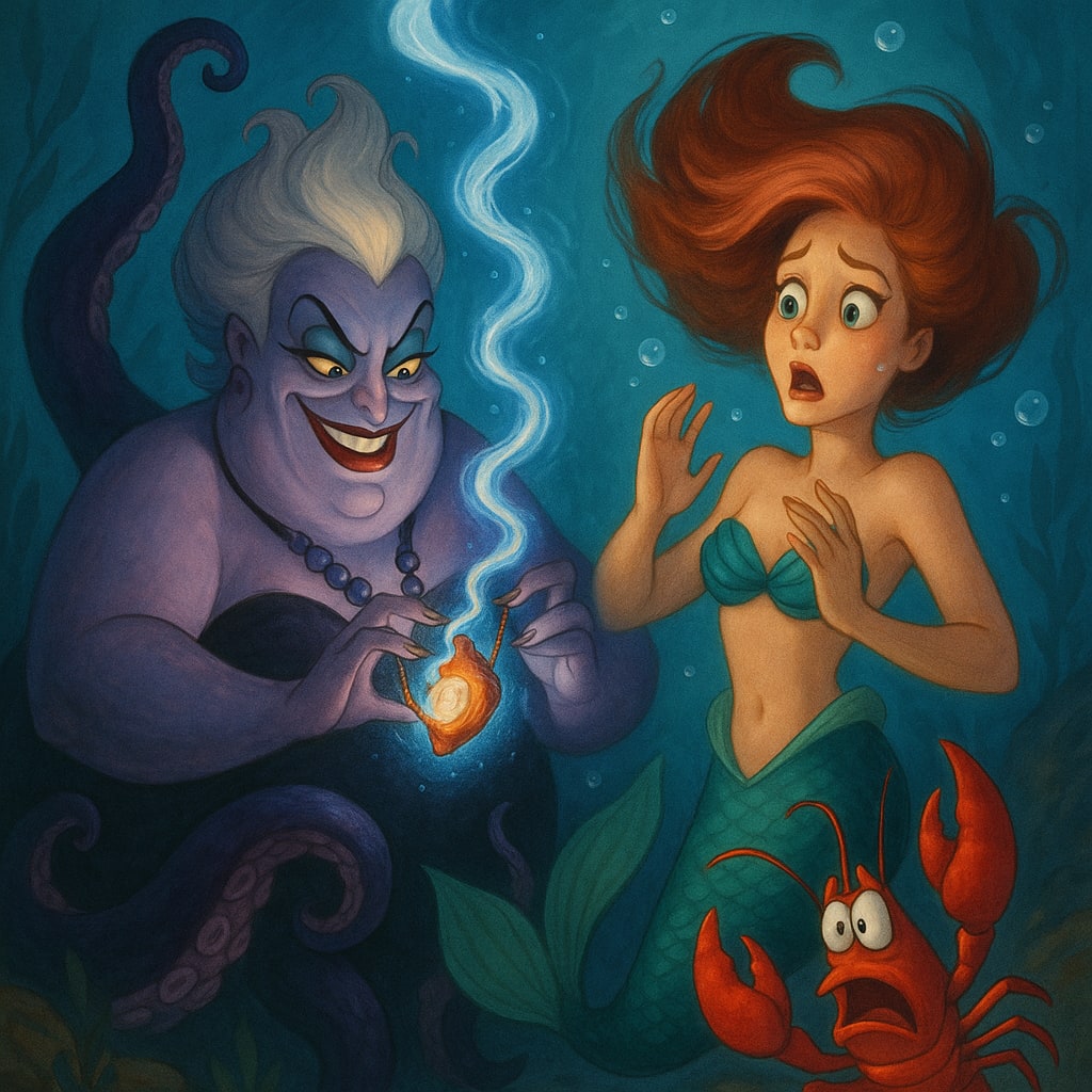 /showme octopus queen lady stealing mermaid’s voice with a shell necklace. The lobster is shook! It doesn’t look like the popular movie, though.
