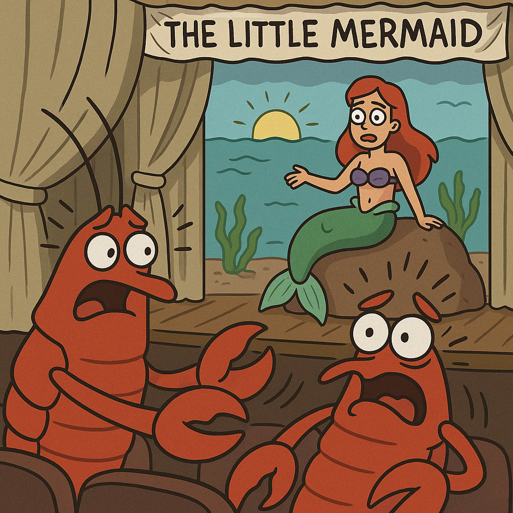 /showme a shook lobster being shaken by a lobster who is shook. They are watching a knockoff stage play of the little mermaid