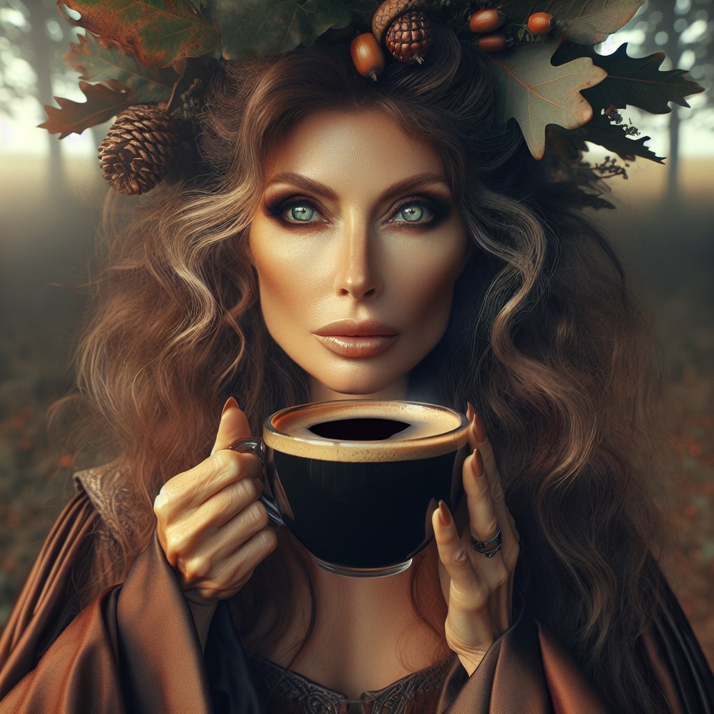 /showme the goddess Cerridwen drinking a large cup of black coffee