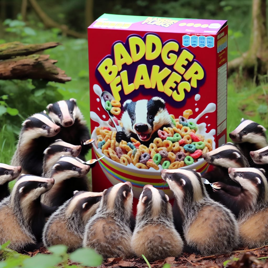 /showme a box of Badger Flakes cereal being eaten by badgers with a spoon.