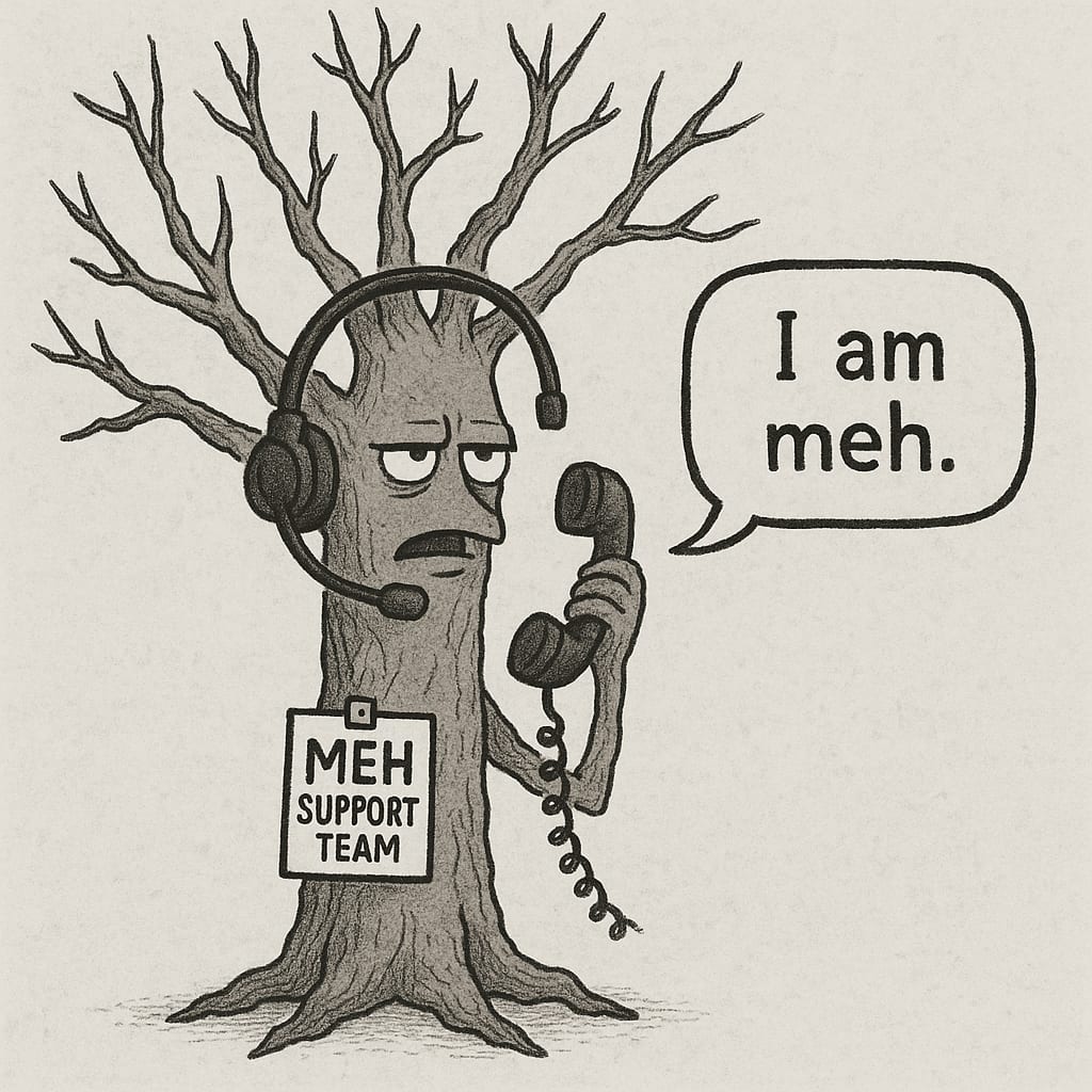/showme leafless tree wearing badge that says “meh support team” is answering phone and responding “I am meh” to all questions.