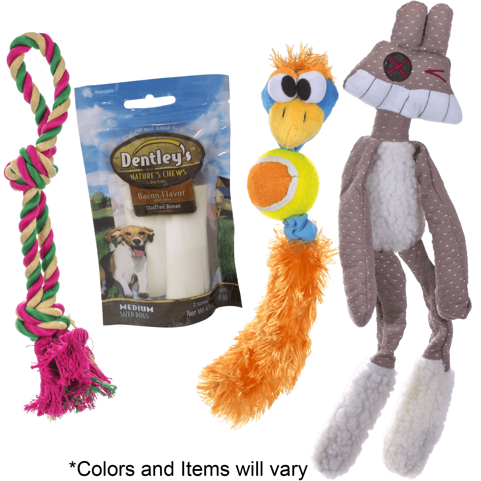 Be forewarned, if you get a bully stick, they are horrendously stinky. The bird with the tennis ball body was fun but quickly destroyed by our pup. The rope is still around and great for tug of war. Cheapy toys for a cheap price. I'm tempted to buy again and hope for no pizzle.