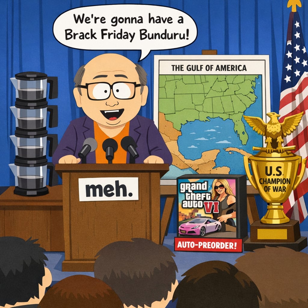 /showme in the style of South Park. The President of Meh.com hears about the upcoming shipping war and raises the stakes by announcing a Brack Friday Bunduru which includes four cold brew coffee makers, a map of the gulf of America, a United States champion of war trophy, and an automatic pre-order for Grand Theft Auto VI.