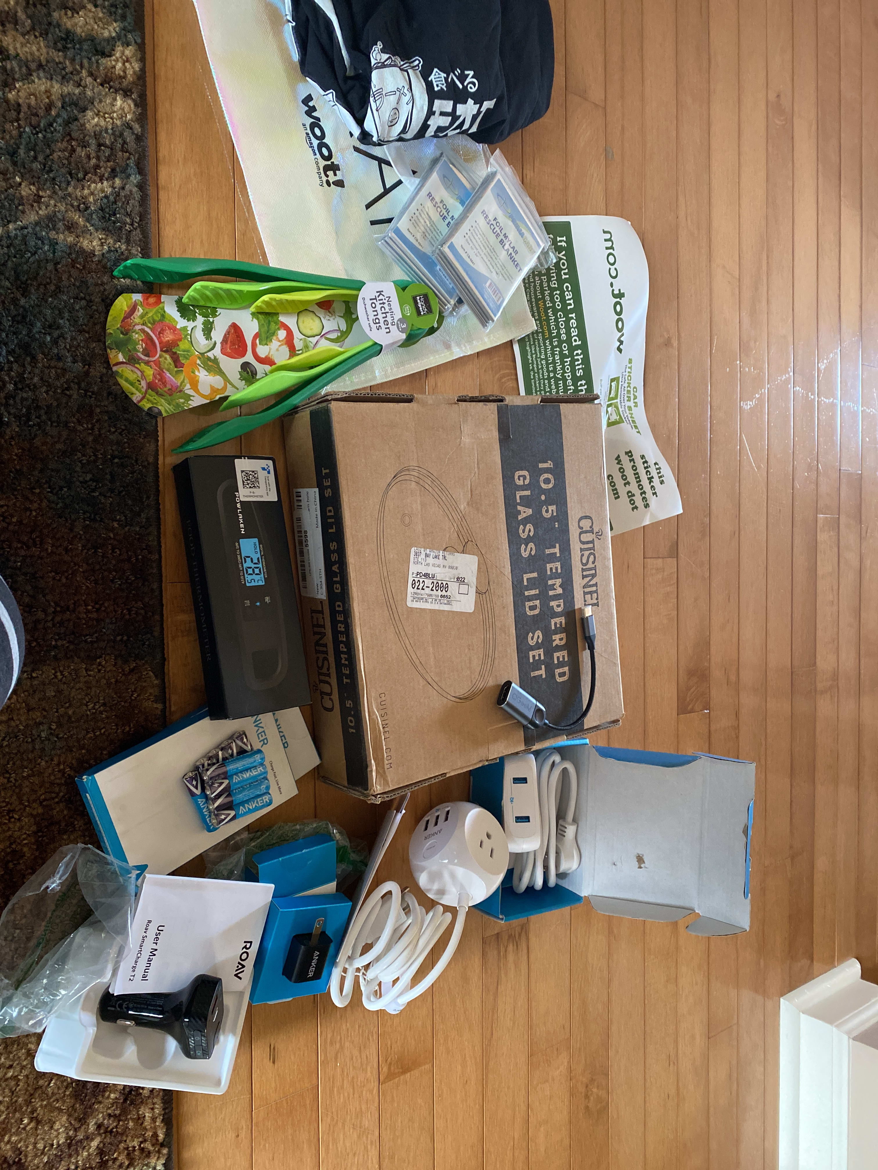 It looks like there trying to copy mens bag. It’s the same style but smaller and shinny but no pockets. I got a bunch of anker stuff. Those two boxes under the batteries are filled with triple aaa batteries. A shirt that I don’t understand, digital thermometer, tongs, lid to a pot/pan, some kind of car transmitter for Bluetooth calling (looks to be pretty good) and some usc cord. I’m happy with it, batteries are always useful, I’ll use the plugs in my basement. Oh and I’ll see if the transmitter thing works in the outlet in my counsel, I don’t have a cigarette lighter in my car.